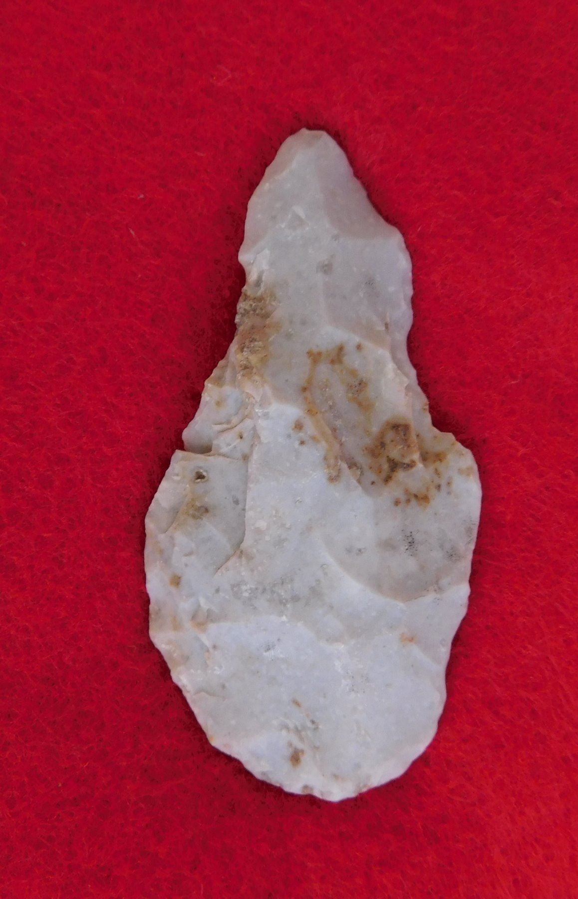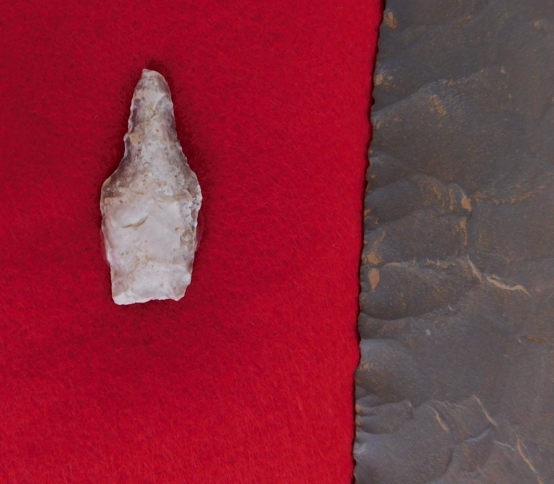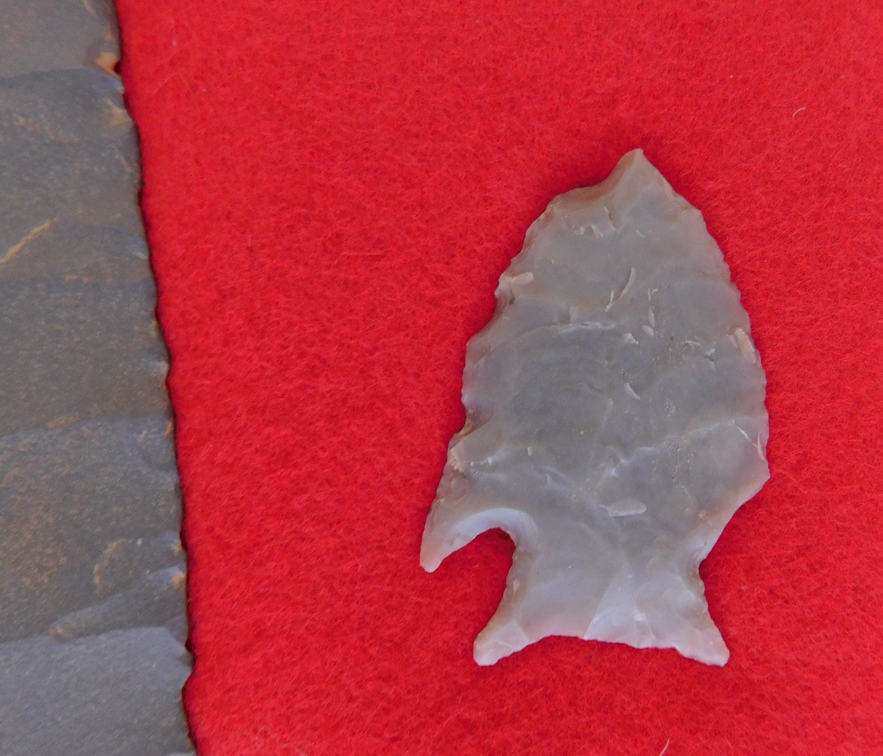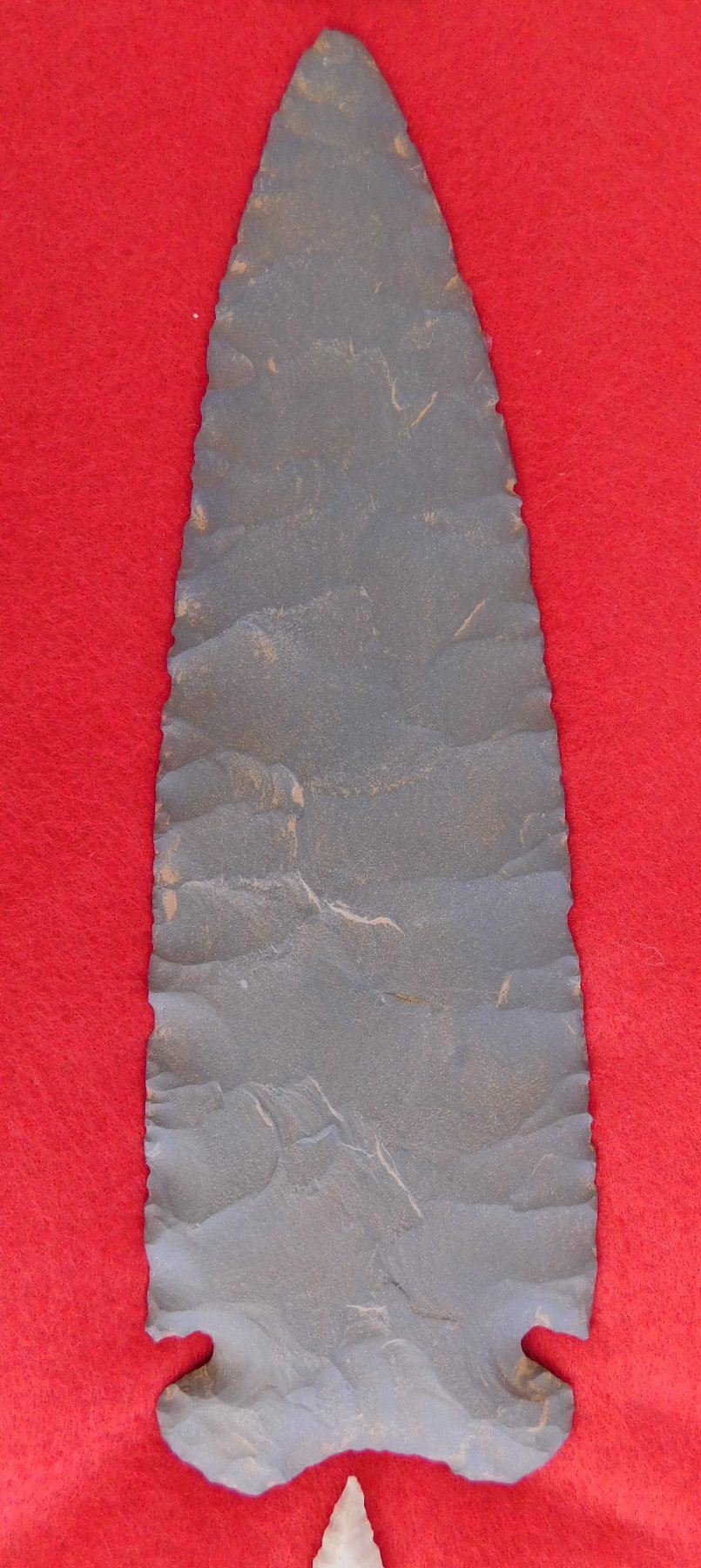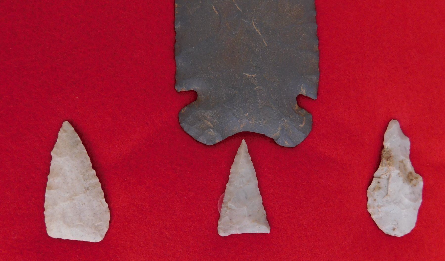 Flint Collection, pre-historic items. Made of flint and chert, the longest point measures 7". Le Flore County, Oklahoma. Frame not included. Condition: Some points have damage, see images. Shipping: $25.00 w/insurance and signature, due to value.