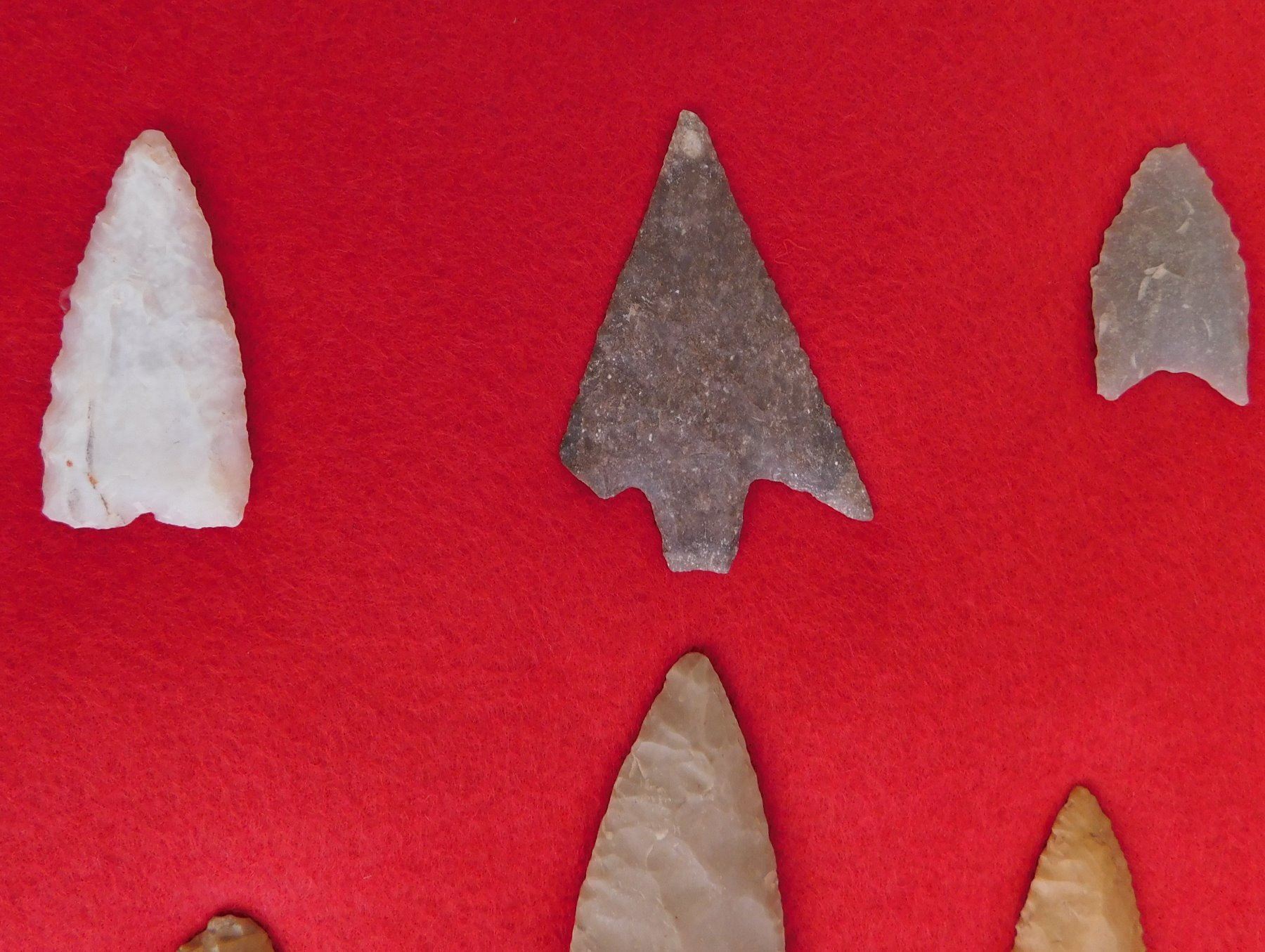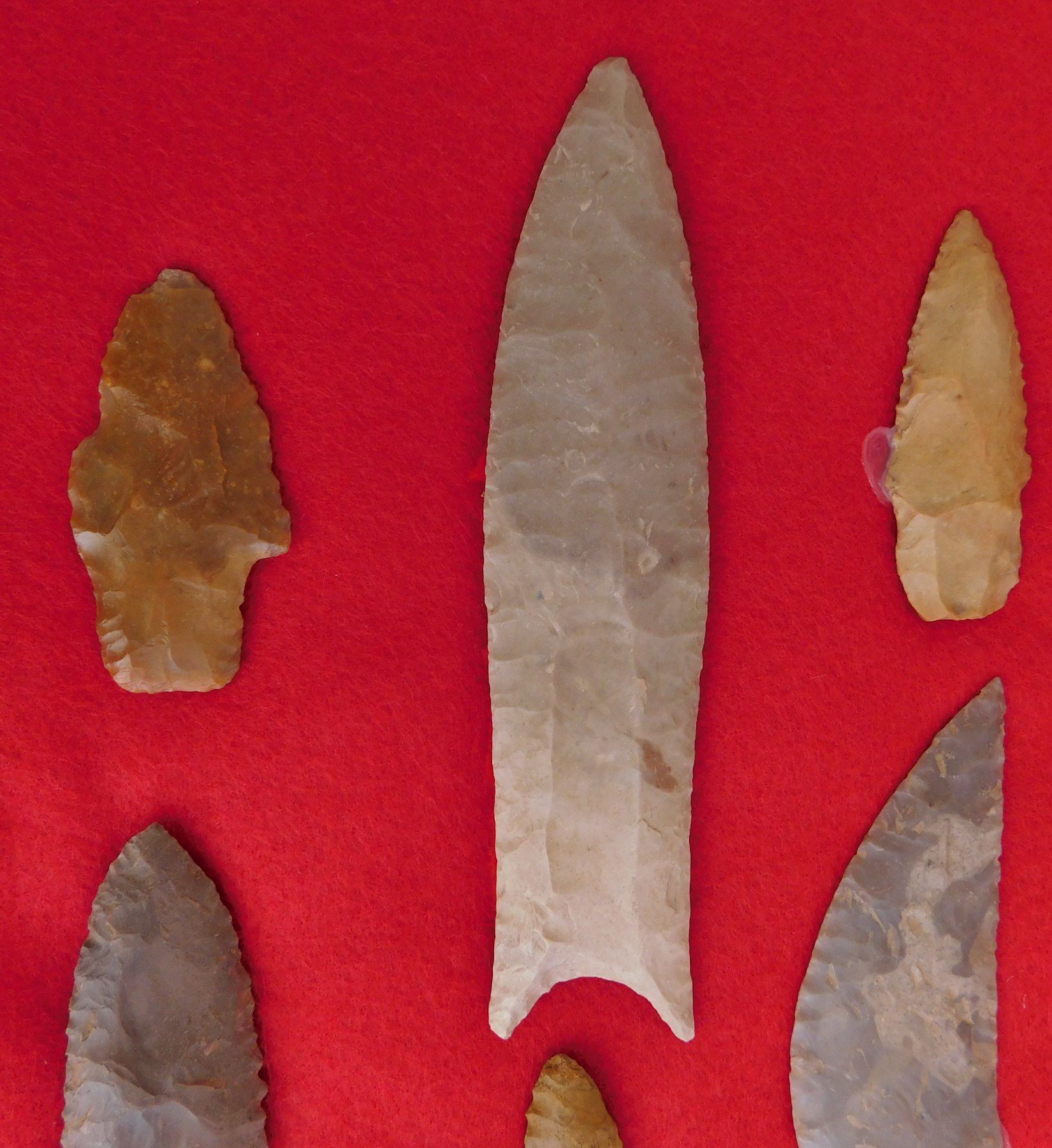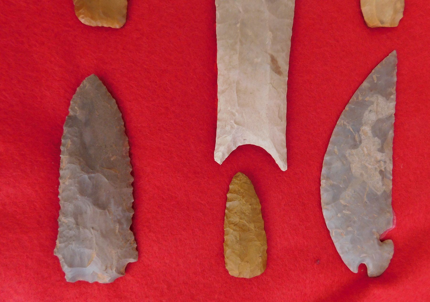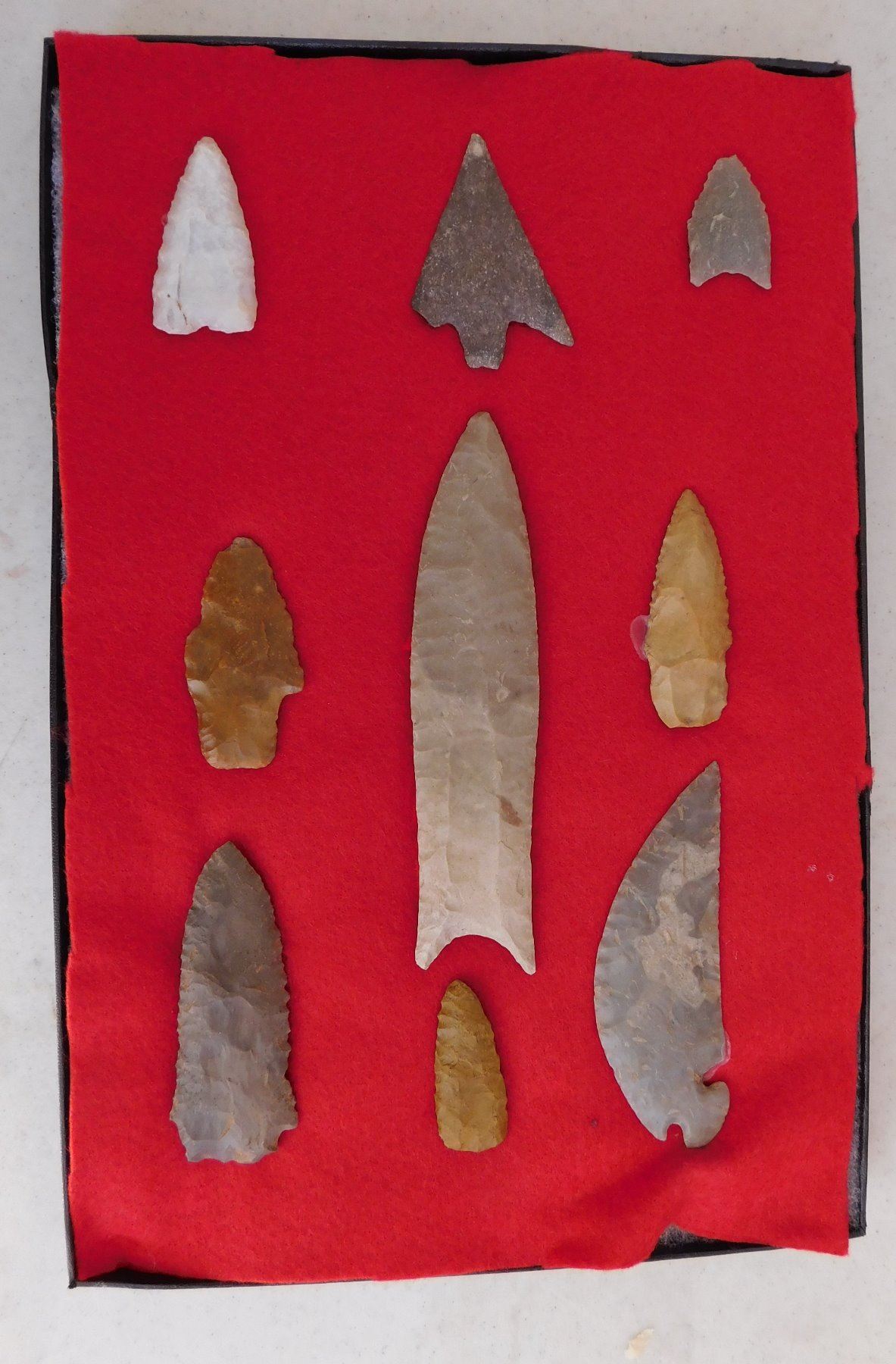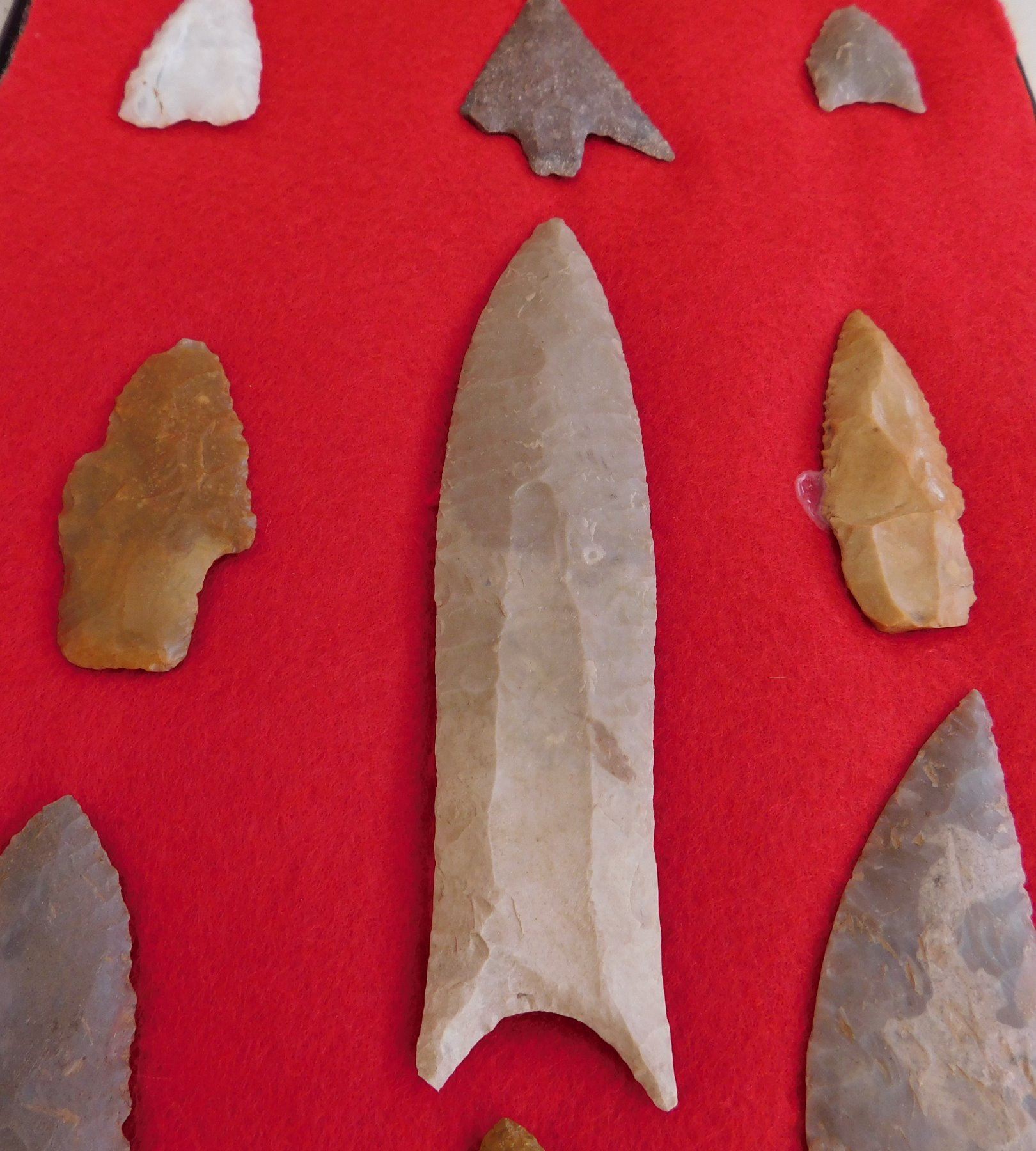 Flint Collection, pre-historic items. Made of chert and quartz, the longest item measures 5 1/2". Western Texas. Nice corner tang knife. Frame not included. Condition: Some have chips, see images. Shipping: $25.00 w/insurance and signature, due to value.
