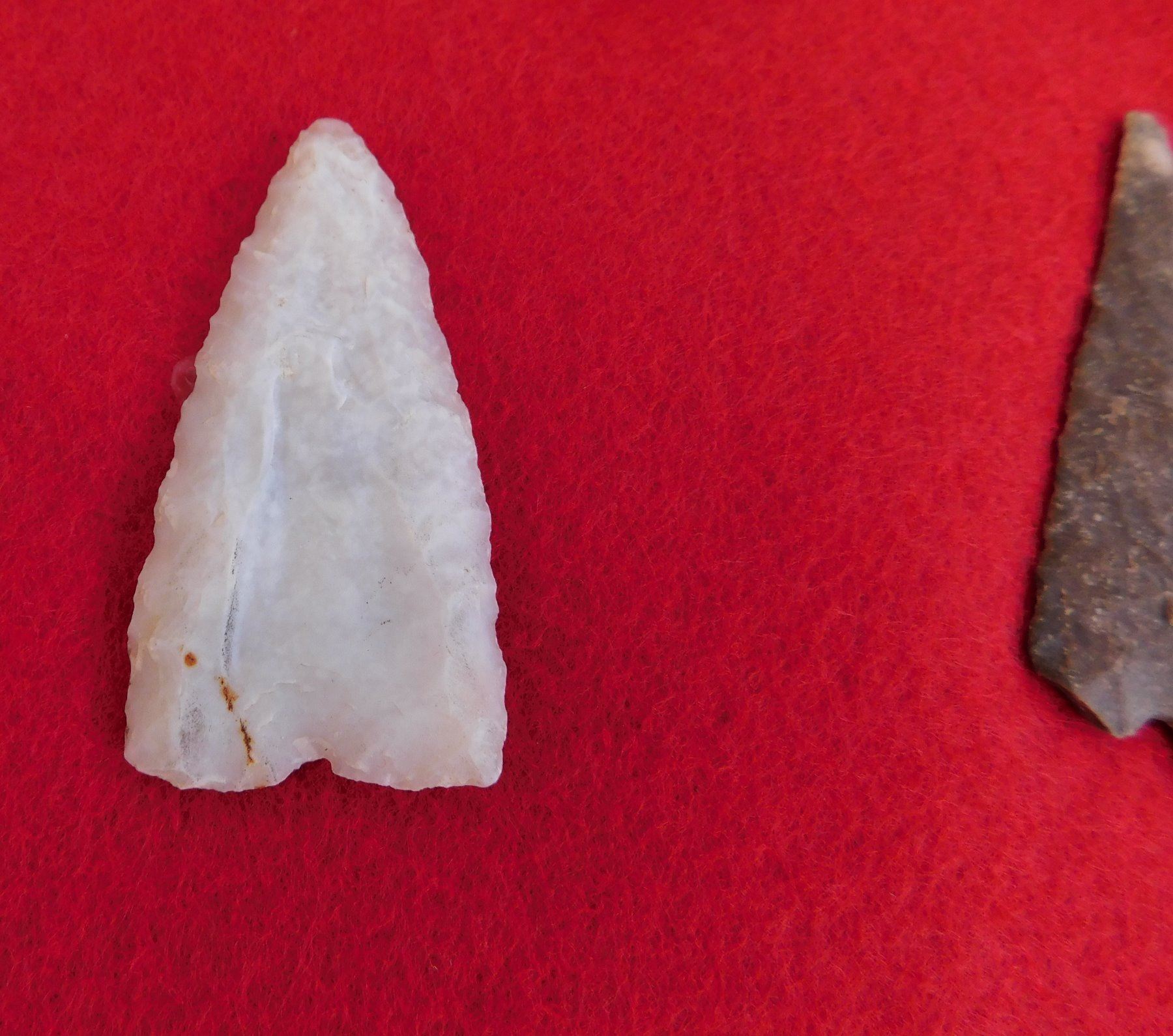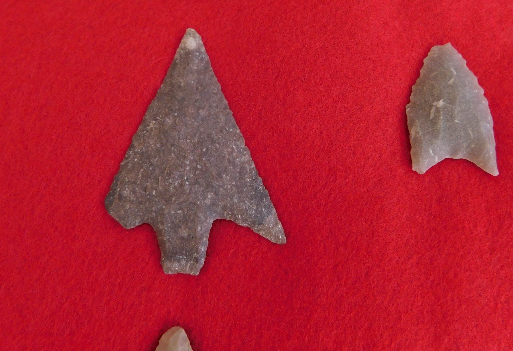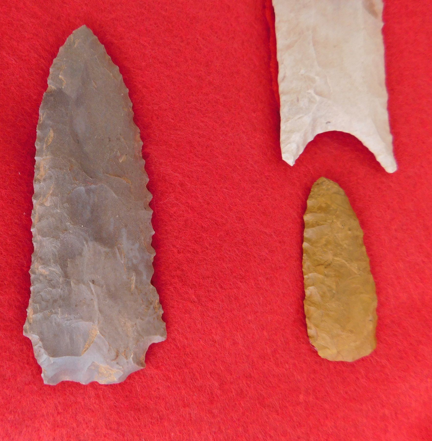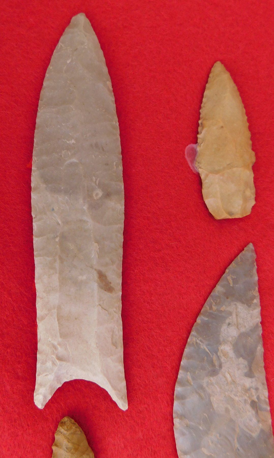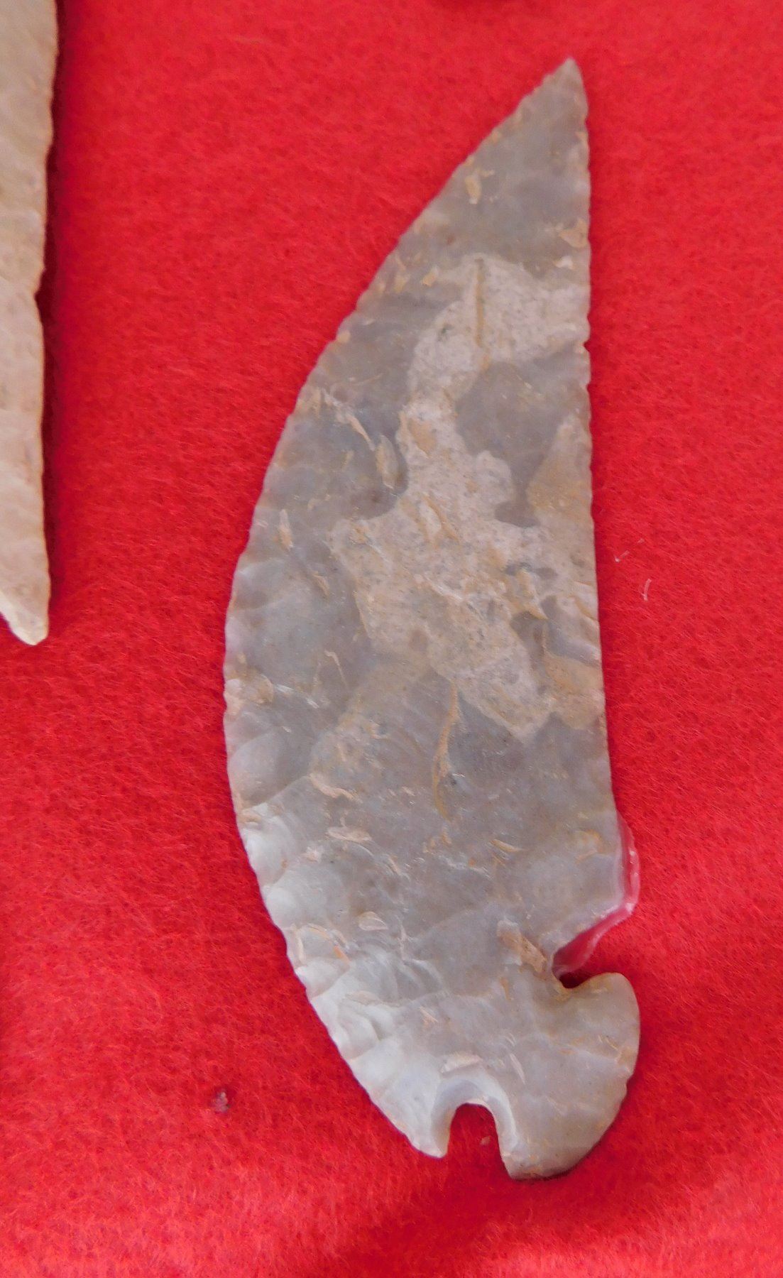 Flint Collection, pre-historic items. Made of chert and quartz, the longest item measures 5 1/2". Western Texas. Nice corner tang knife. Frame not included. Condition: Some have chips, see images. Shipping: $25.00 w/insurance and signature, due to value.