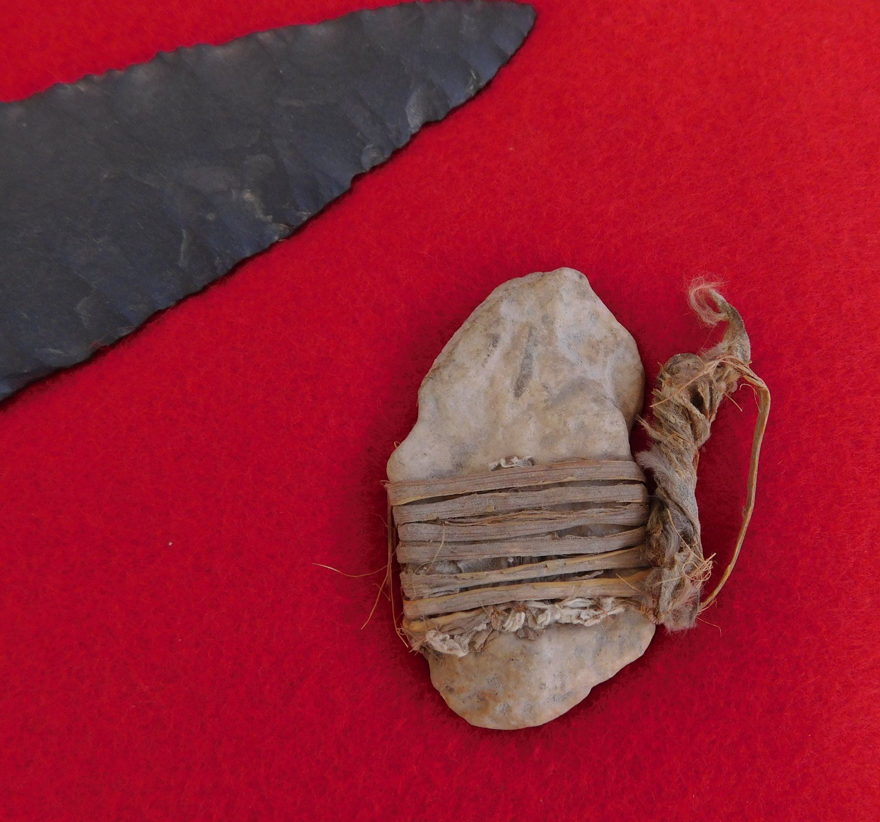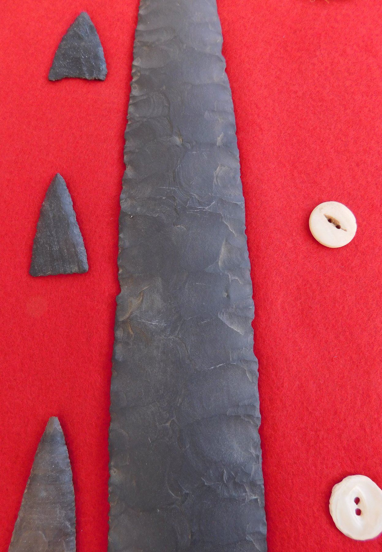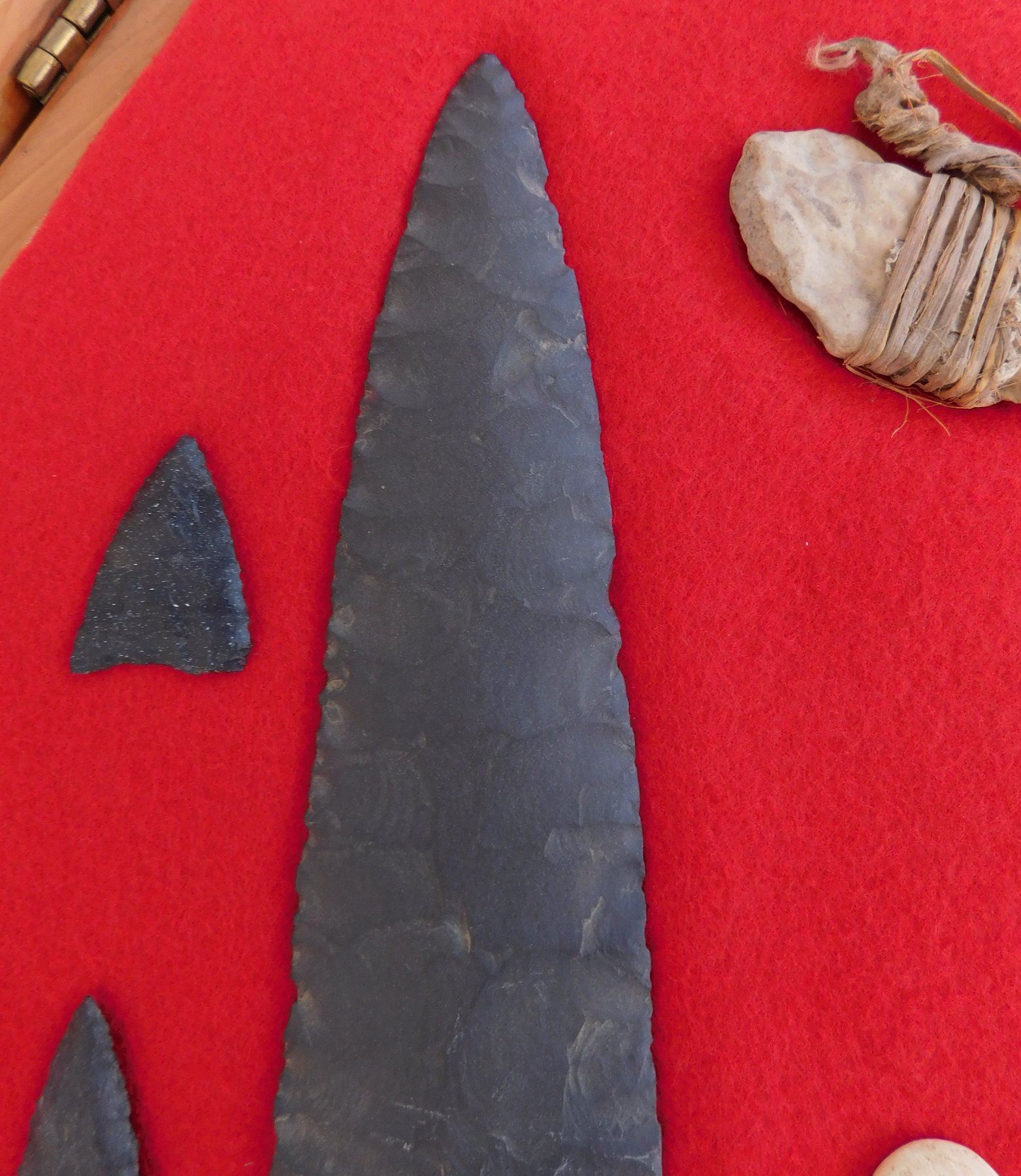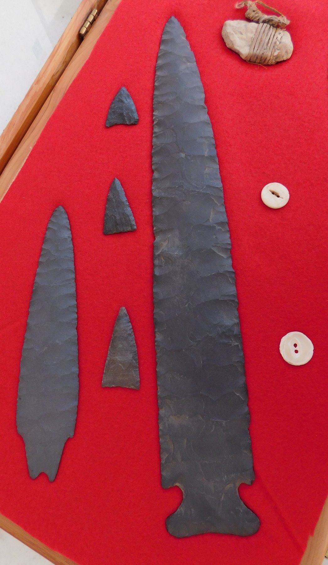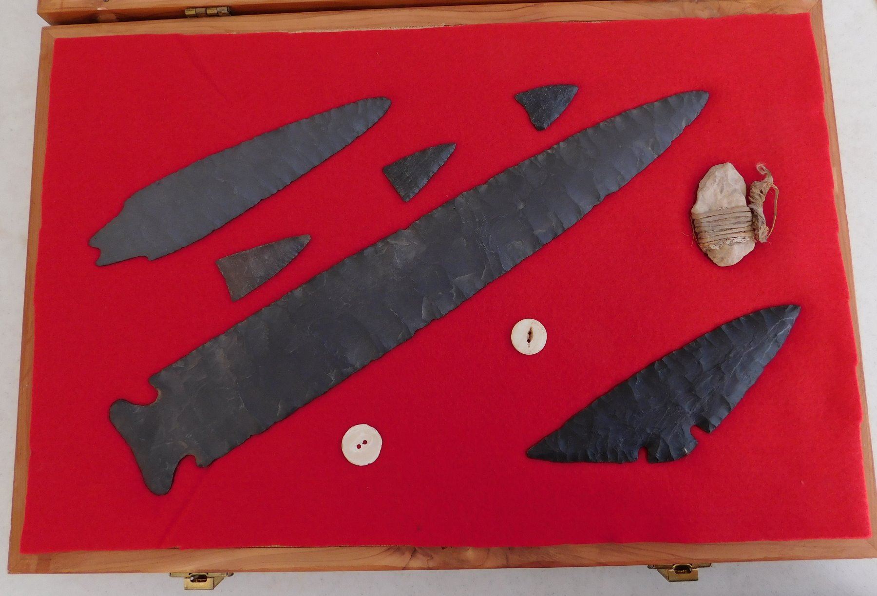 Flint Collection, pre-historic items. Made of chert, sandstone and shell, the longest point is 14 1/2". Oklahoma. Pre-historic wrapped stone fetish. Cave fine, private land. Frame not included. Condition: Minor edge dings, see images. Shipping: $30.00 w/insurance and signature, due to length and value.