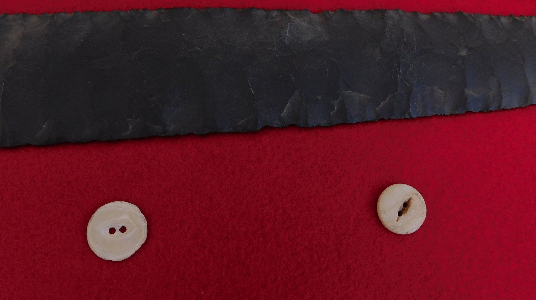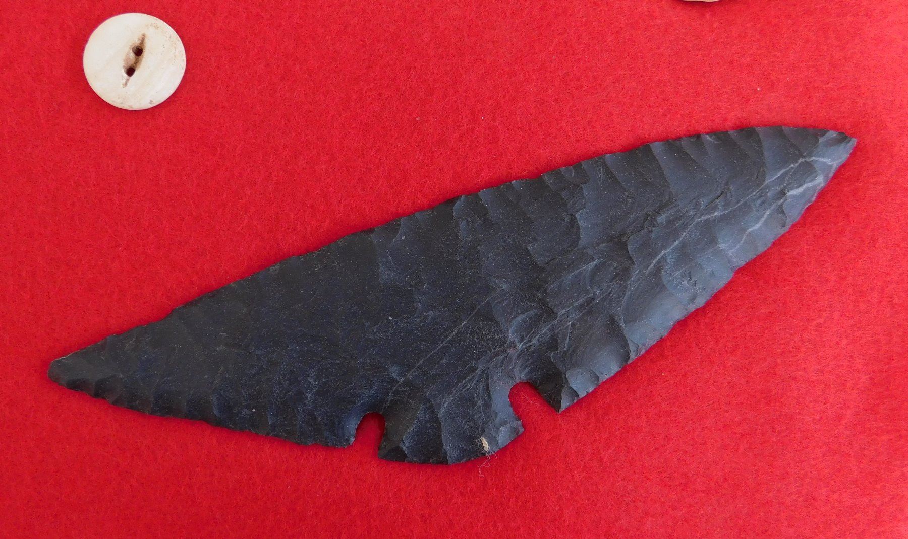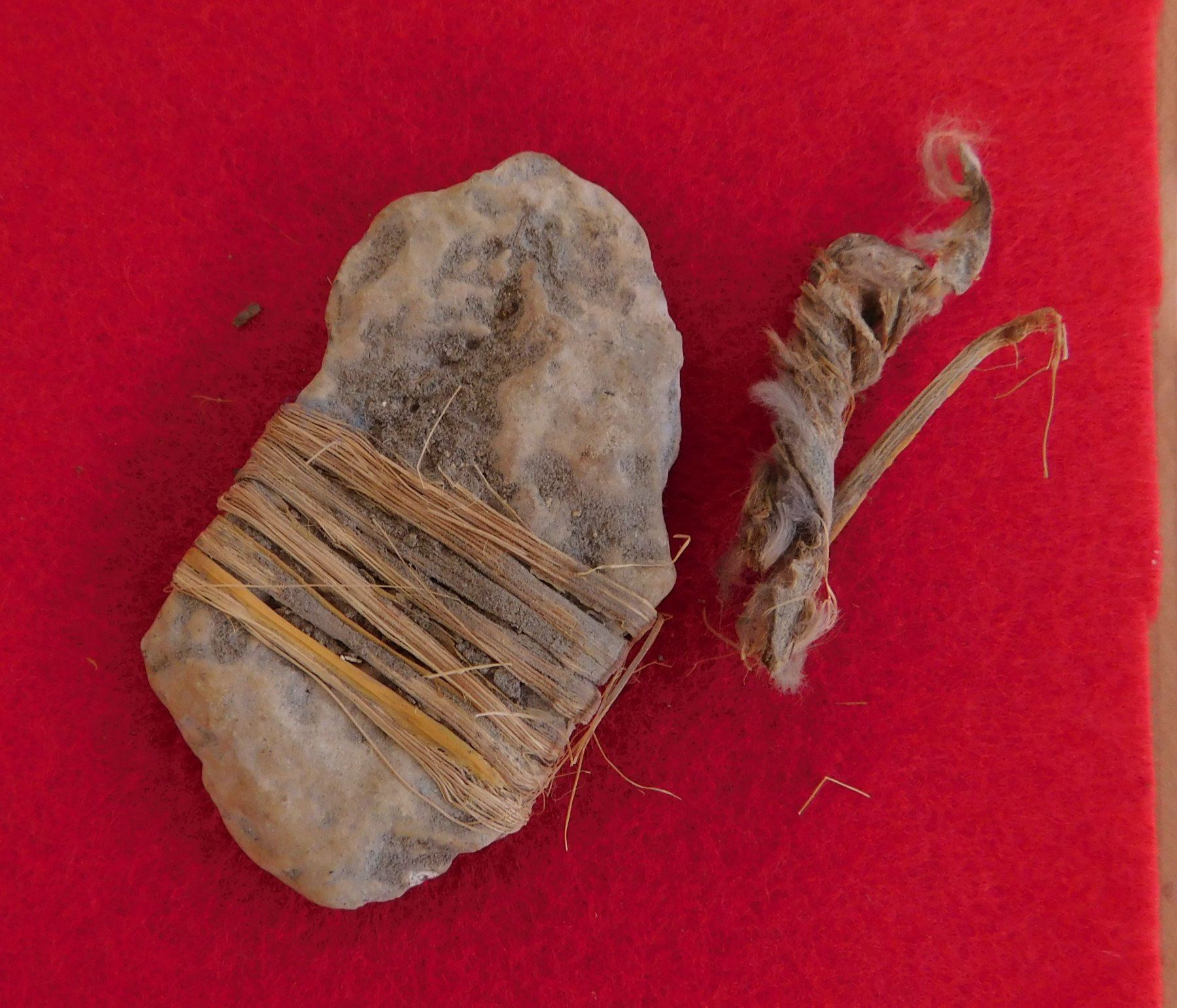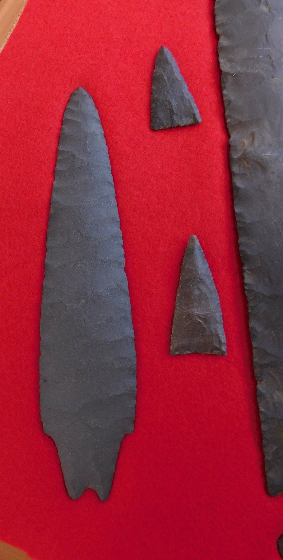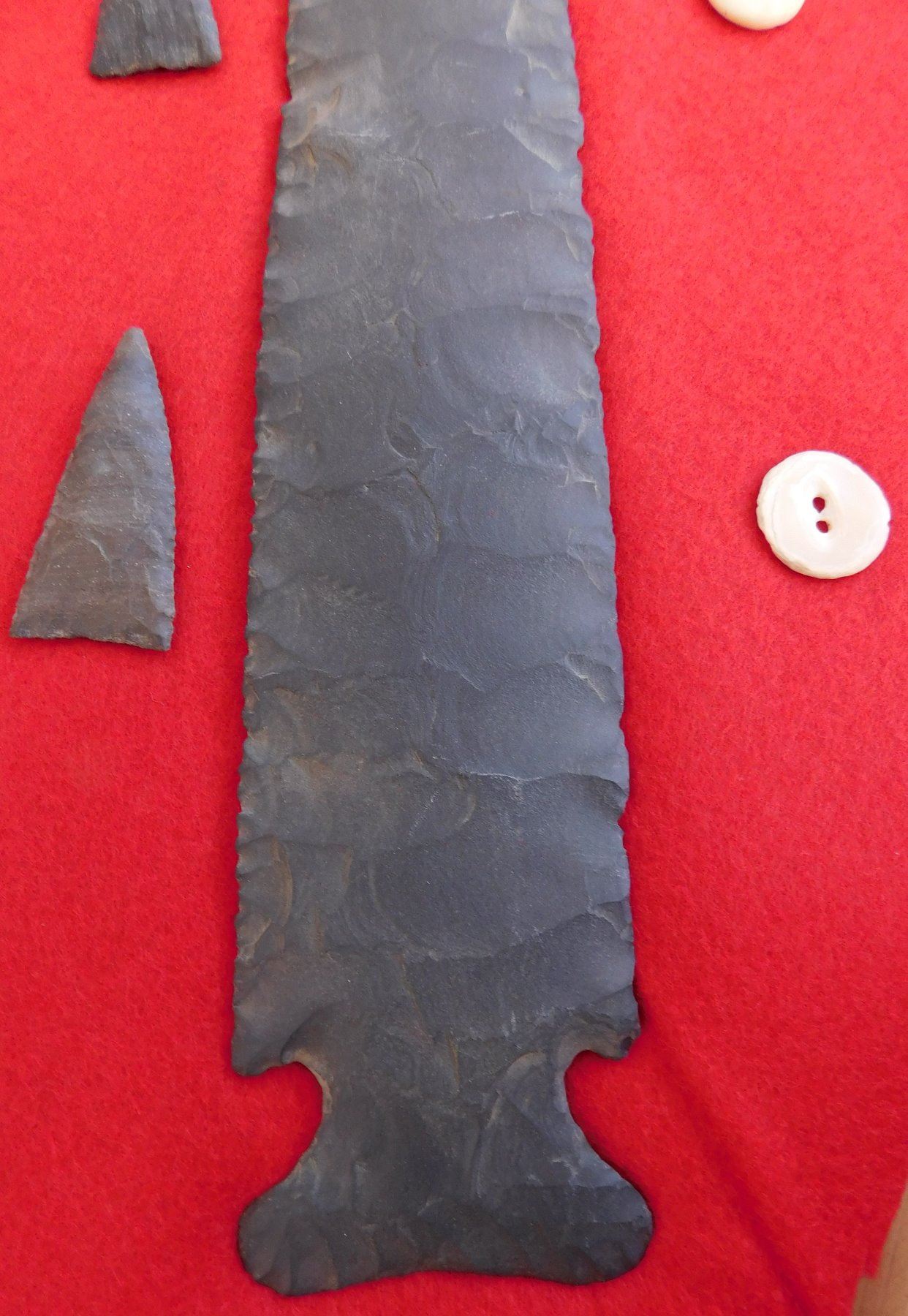 Flint Collection, pre-historic items. Made of chert, sandstone and shell, the longest point is 14 1/2". Oklahoma. Pre-historic wrapped stone fetish. Cave fine, private land. Frame not included. Condition: Minor edge dings, see images. Shipping: $30.00 w/insurance and signature, due to length and value.