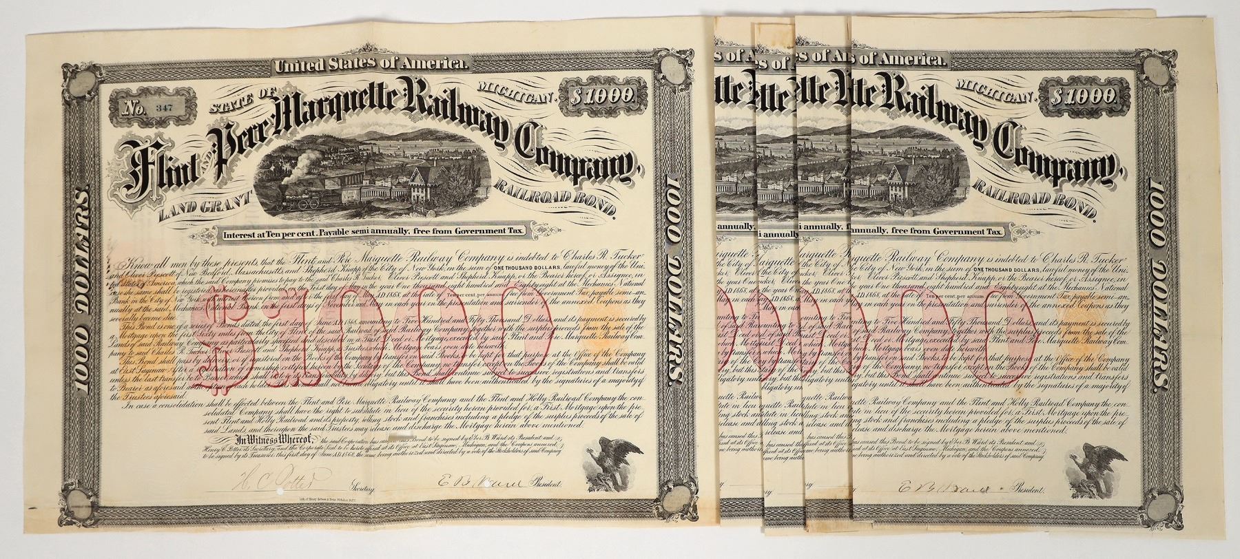 Lot of 5 issued and cancelled 1868. Each has three revenue imprints: two RN-P5 and one RN-W2. Black border and print, nice vignette of locomotive with city in the background. Signed by secretary Potter and president Ward. Operated 1857-1899. Became part of the Pere Marquette Railway.