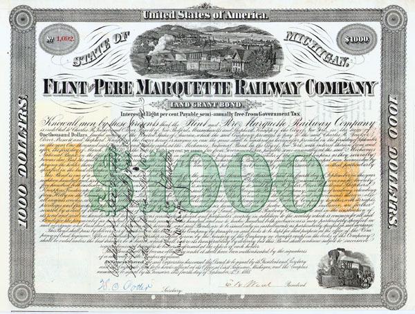 1868, Michigan. $1000 bond bearing 8% interest. Black/White with green overprint. Vignette of train with panaromic scene of town in background at top center. Pen and punch cancelled. Very fine.
