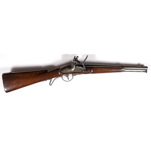 <Our item number 140715><B>Flintlock Calvary Carbine.</B> Circa 1820's. This rifle is of Fench Belgian origin used by the Hussars (elite calvary unit). Length 29 1/2 in. Condition very good, only the expected slight scattered nicks in stock. Hardware has drifted to a smooth grey patina virtually free of any pitting. An excellent example considering its age. <BR>Estimated Value $900 - 1,100. <BR><BR>Our item number 140715<BR><IMAGES><P ALIGN="CENTER"><IMG SRC="http://www.goldbergcoins.net/liveauction/49jpegs/140715.jpg"> </P></IMAGES>
