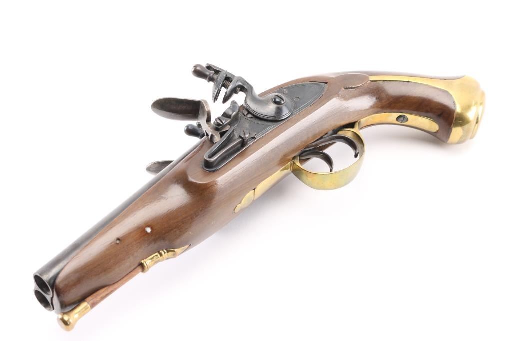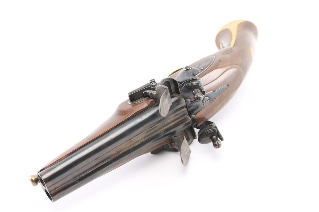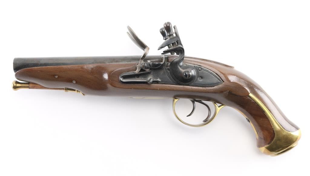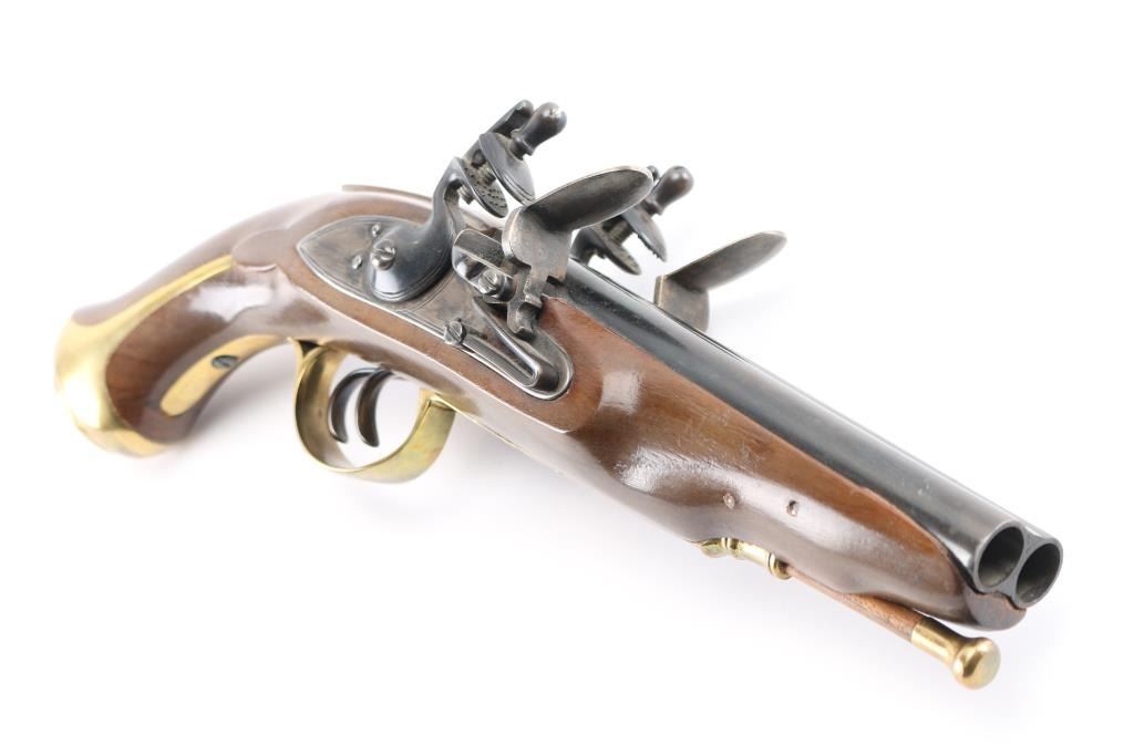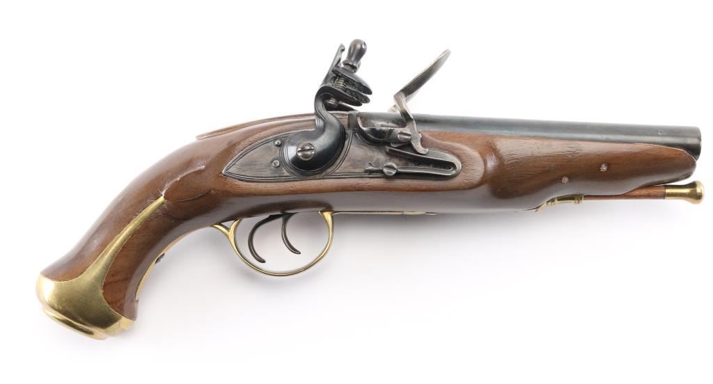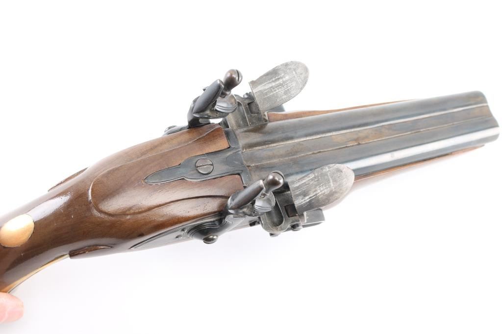 Unsigned modern reproduction black powder muzzleloader. Features blued finish, brass triggerguard and butt pommel, dual triggers and dual side locks, 6.75" smooth bore barrels, ramrod. Bores are clean, very bright, appear unfired. Retains 95% finish with handling marks. Wood stock is excellent. Condition is NRA Excellent *** "Antique" Firearm ***