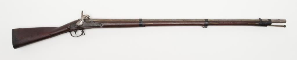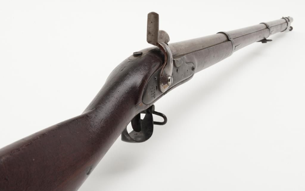 Flintlock Harpers Ferry rifle in-barrel conversion (Belgian-style cone type) to percussion, .69 cal., 42” barrel, full wood stock, iron ramrod, sling swivels, lockplate dated 1831; V, P and eagle head proofs on barrel at breech along withan M and 43; good action, good stock showing an old coating of varnish that has now checkered from age; a partial cartouche and inspector’s marks visible on the left side of the stock above the trigger. (Antique). Est.: $300-$600.