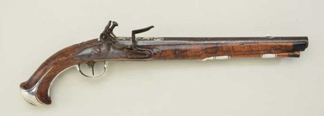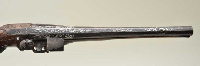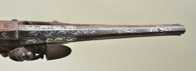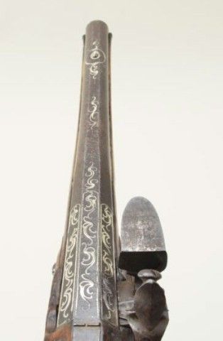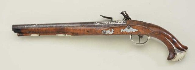 Flintlock Horseman's size pistol with silver mounts and silver inlayed barrel circa mid 18th century of Germanic origin. The pistol measures 19-1/4" overall with approx. 12-1/2" barrel of 64 caliber smooth bore. Thebarrel shows remnants of a damascus pattern and metal surfaces show a dark brown patina finish and some light to moderate pitting and erosion. The stock is nicely raised carved around the tang and mounts with qualitymolding work in the wood. The stock shows some small losses, minor imperfections, normal aging. The pistol is in its original Flintlock state, a horn tipped ramrod is included which matches the fore end cap well. The silver mounts show a hand engraving on the trigger guard and around the lock plate screws. Seldom are these big pistols silver mounted and we would date this Flint at about 1740-1770. Est.; $2,500-$5,000.