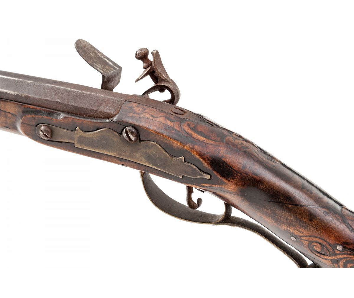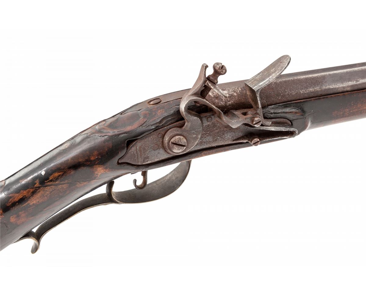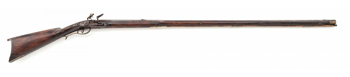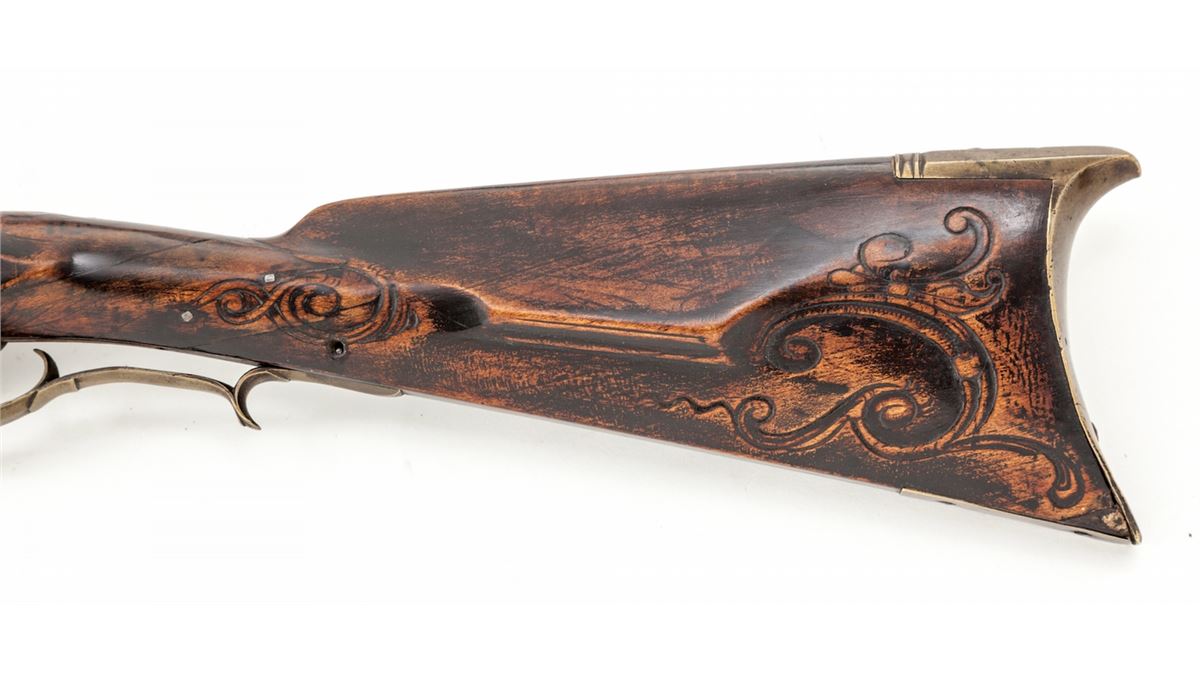 Flintlock Kentucky Rifle, signed ''A. (Adam) Ernst'' in script on top barrel flate, .54 cal. smoothbore, 46-1/2'' octagonal barrel with four barrel keys, 62'' overall, maple stock relief carved behind and in front of cheekpiece and around barrel tang. Mfg'd in the 1810 period. Adam Ernst, a well-respected gunsmith of the period, worked in York County, PA, during the early 19th Century. The fancy curled trigger is one of his trademarks. Condition is very good, properly reconverted back to its original flintlock configuration. Stock has a period wrist repair with seam and three small square-head nails visible; a 15'' front section of the forend has been properly restored and barely visible to the eye, with some finish reapplied to the stock which shows period wear. Est.: $3,000-$4,000. (Antique)
