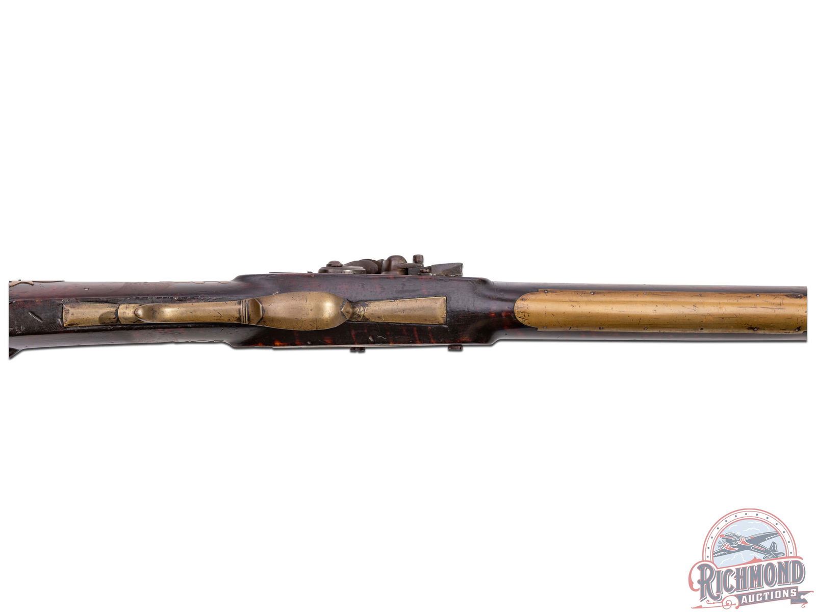 Overall Good with brass unpolished and having an older aged looking patina. Wood has traces of finishing with handling dings and marks. Dark bore with functioning mechanics. Small crack in front of lock and trigger guard.