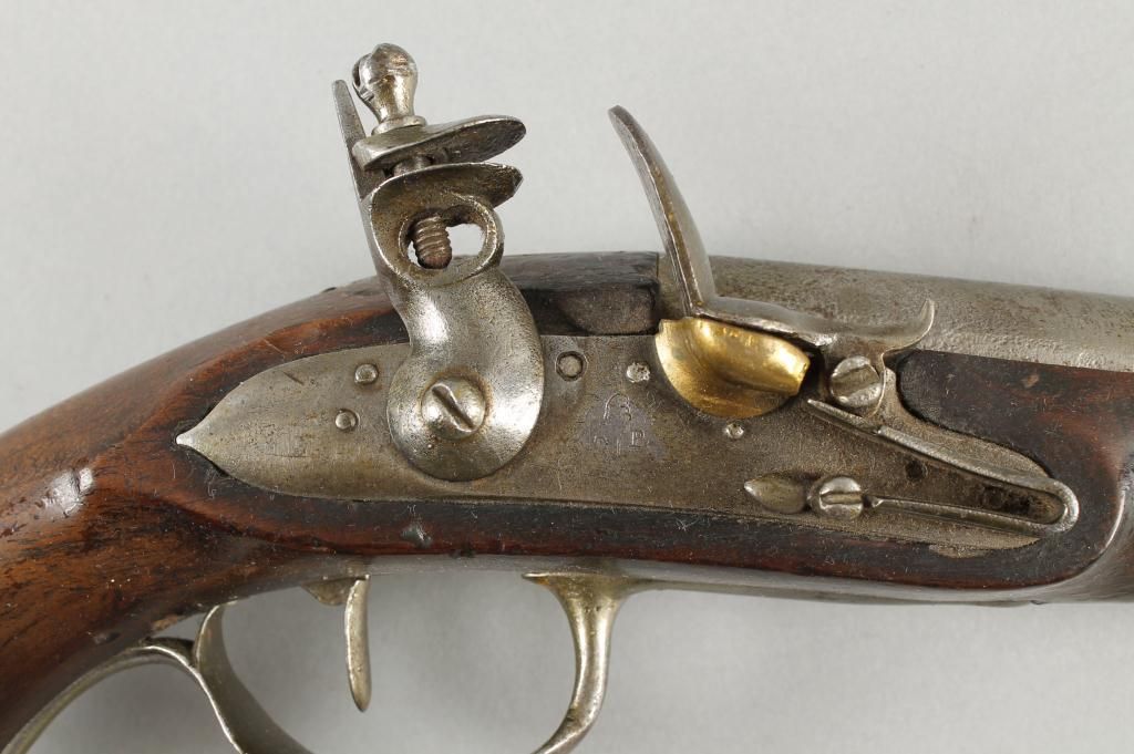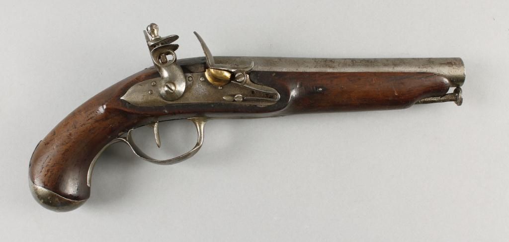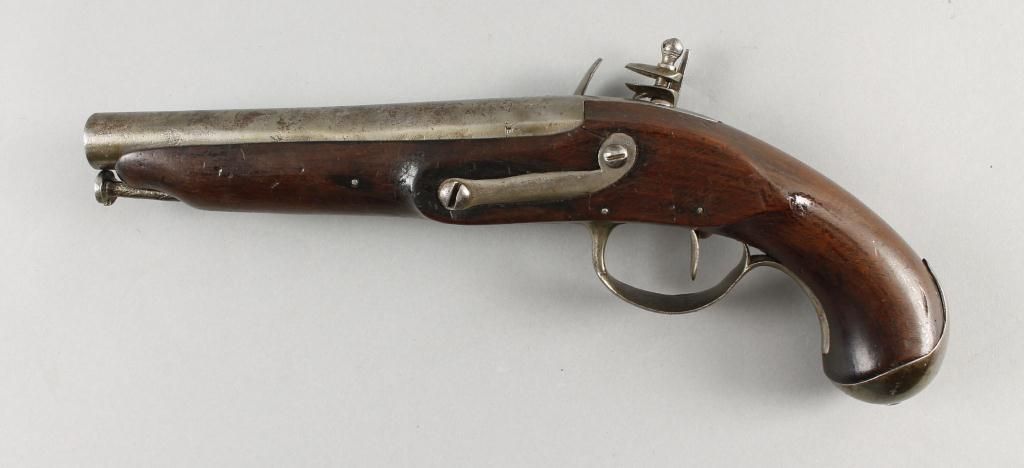 Flintlock Pistol Cal approx .70 SN:NVSNMid to late 1700s, very faint markings, 7.5" barrel, steel trigger guard and pommel cap. Condition: Good showing light pitting on metal parts, wood is good.