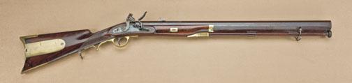 Flintlock big game hunting rifle by Parker Field & Son, 233 Holborn St. London. Approx. 6-bore (or nearly 1”) measuring 1-3/8” across barrel flats, rifled from breech to muzzle, deeply rifled. Measures approx. 46-1/4” overall with 30” heavy octagon barrel. Weight is approx. 14-1/2 pounds. Shows a brown barrel, case hardened lock, brass mount with checkered wrist. Mounted with swing swivels and large baker-style brass patchbox. The rifle remains in fine to excellent original condition with 90-95% original brown on barrel. Just a couple areas of erosion and pinprick pitting, but very crisp edges and beautiful tobacco brown with striping. The lock shows 60-80% case hardening, just starting to drift to silver. Original case hardened hammer and frizzen with some toning and light erosion and pinprick pitting just starting. The breech and tang show traces of case hardening going silvery grey. There is some dried oil and just starting metal age. The rifle shows a platinum plug and the bore is excellent and shows almost no use. The stock is very good plus with sharp checkering and would be fine other than an area of compression and small losses just above the trigger and below the lock plate on the