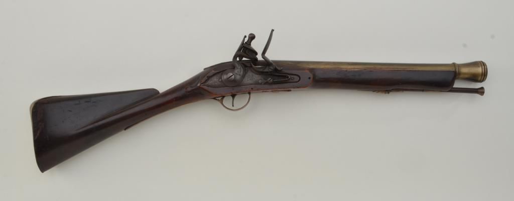 Flintlock blunderbuss, 20th century in the style of the 18th century, approx. 30” overall with a 15-1/2” brass barrel, lockplate marked “Lott”; wood stock shows old repair on left side of fore stock. Est.: $300-$600.