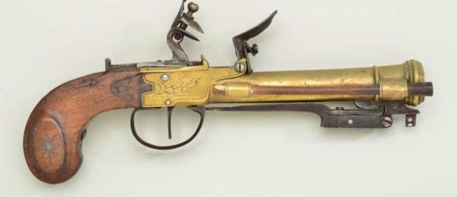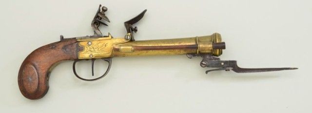 Flintlock boar sword with forged steel grip probably German, circa late 18th century and right side of barrel marked “L.R.” with lightly engraved blade showing traces of gold gilt. Illustrated pg. 123-124 “Blades &Barrels” by Gordon Frost. Formerly Frank Bivens collection and C. Henricks. The piece measures 27-3/4” overall, blade 22 -1/4”, barrel approx 1-1/2” and gun portion 3-3/4”. The barrel shows a cannon type muzzle and is approx 32 cal smooth. The blade is reinforced at the back and it attaches to the guard thru a slot in hilt. The oddity was made as a unit during the period and is original. The condition is good to very good with some very light pitting and normal age. The action is working and all small parts are original. From an old New York collector’s estate. Est.;$1,500-$3,000.