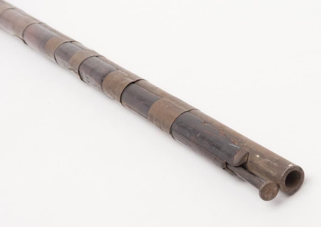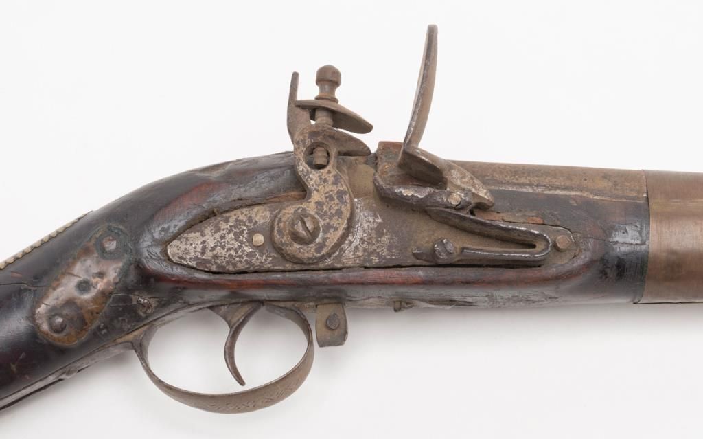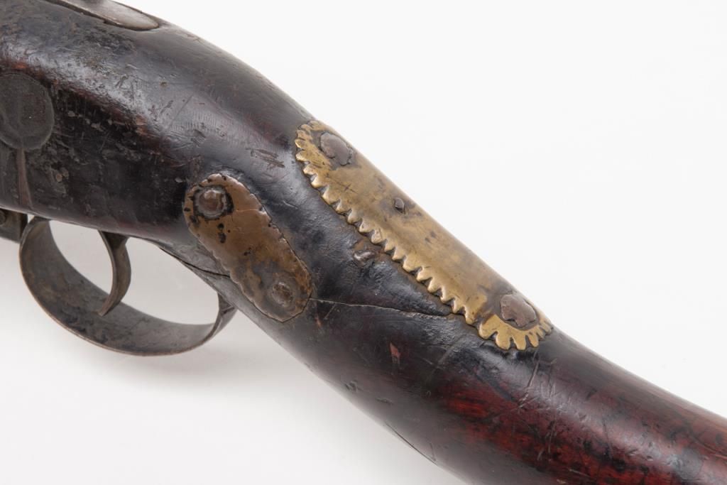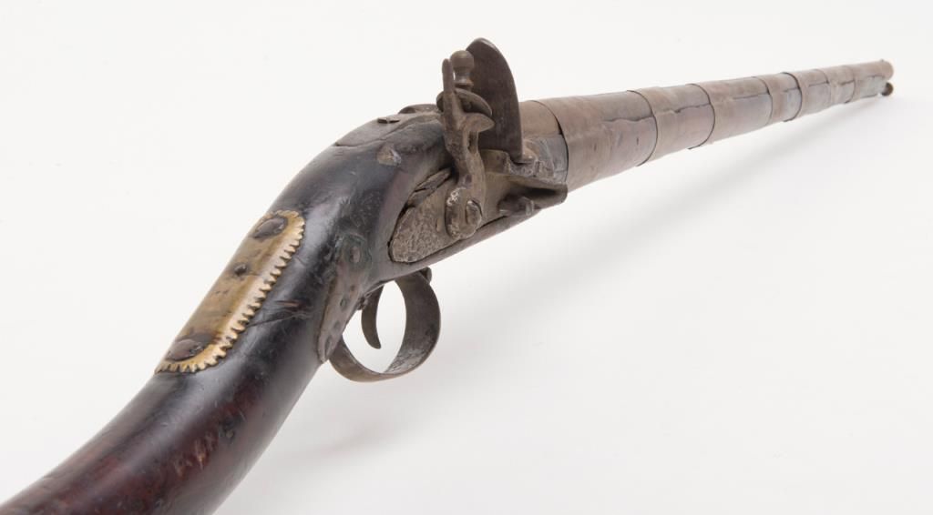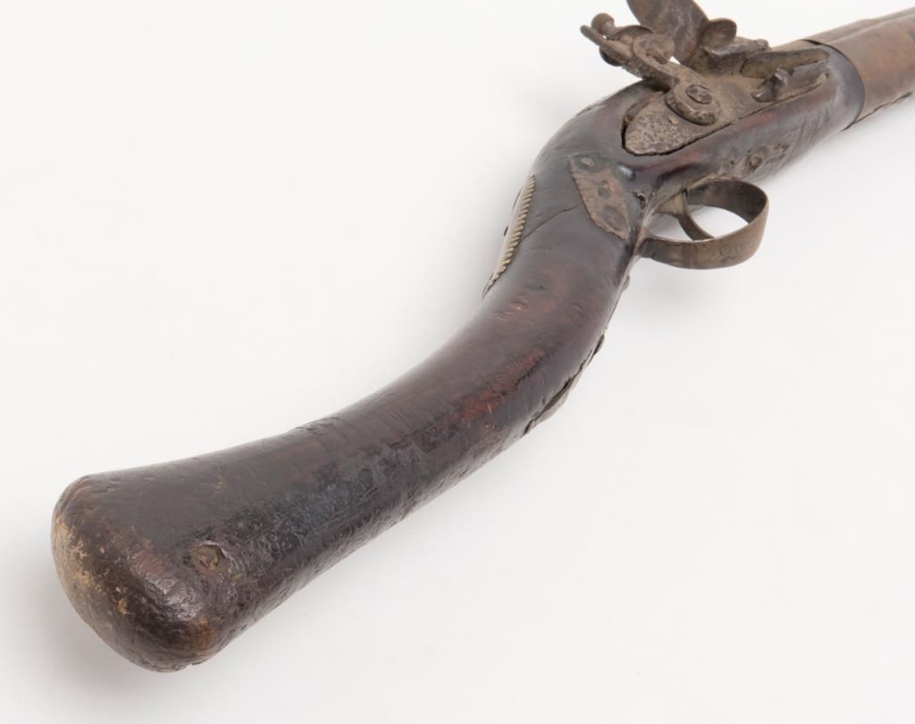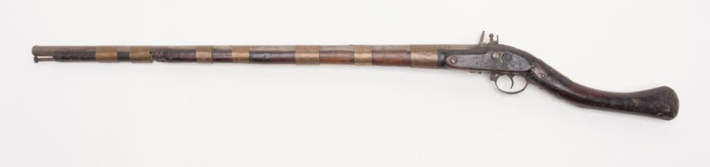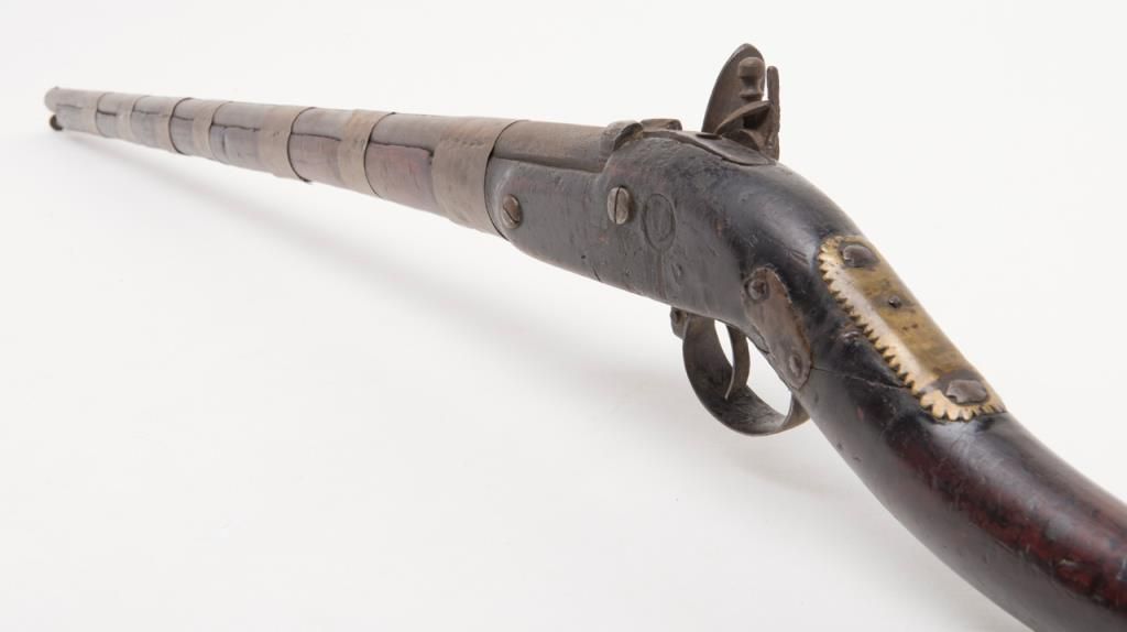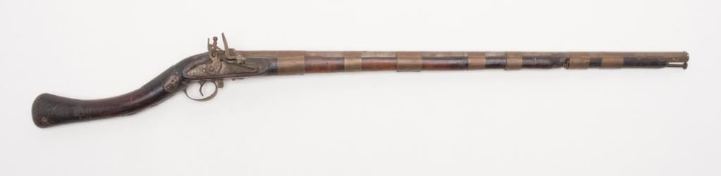 Flintlock camel gun from north Africa or Arabic region showing old break and repairs at the wrist with some heavy pitting and erosion with Damascus pattern on the barrel. The metal surfaces show some light to slightly heavy scattered pitting.The lock is not working. The gun measures approximately 50” overall with 36”smoothbore barrel. By tradition this gun was traded by Sheik Obummer Bin Lossin for a new AK47 which he doesn’t shoot any better but the Russians make a lot ofmoney on selling ammunition. Est.: $175-$350
