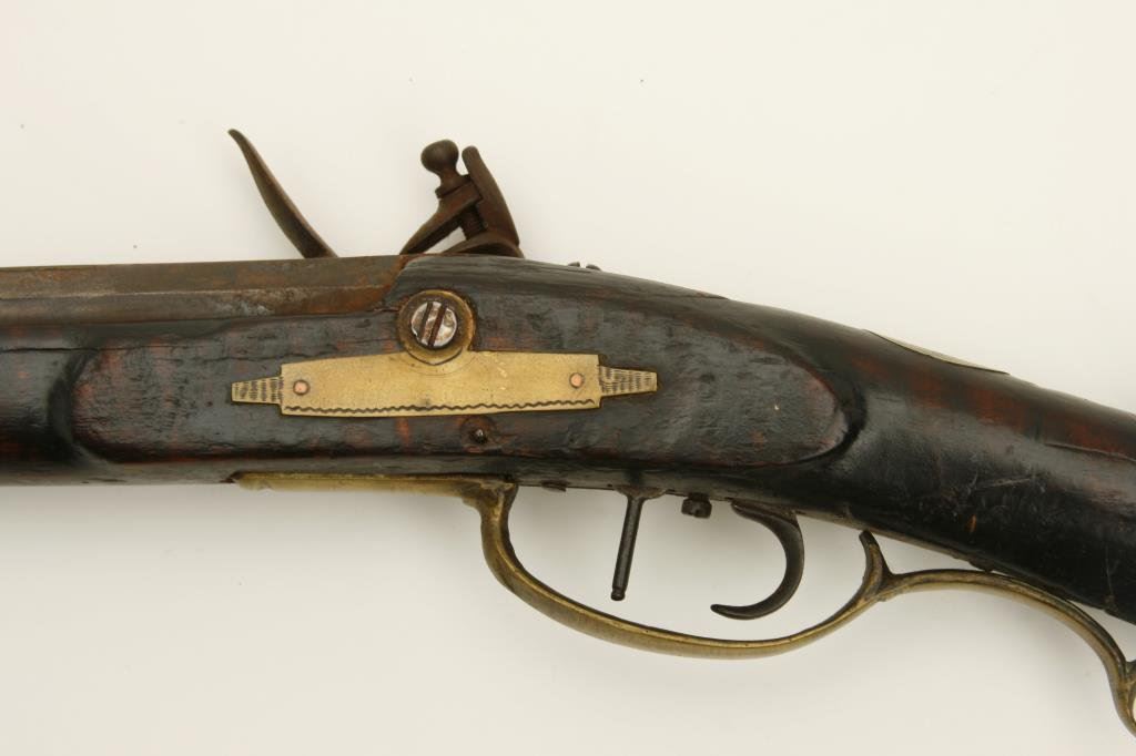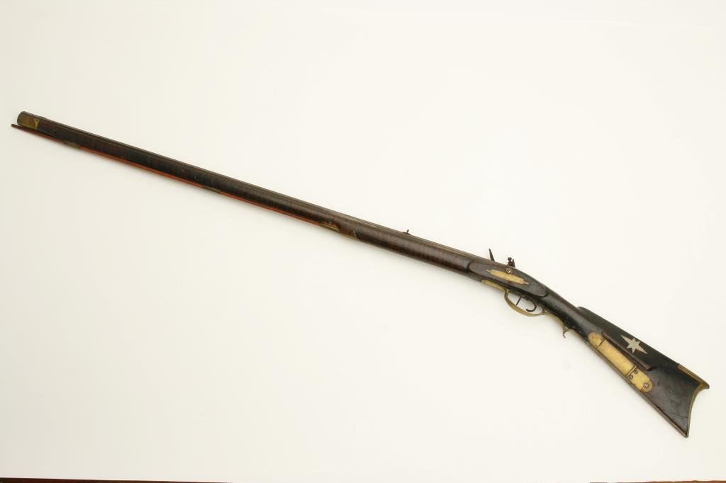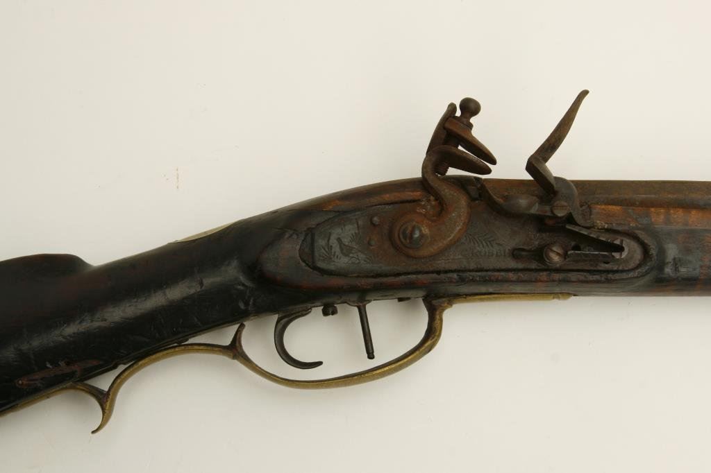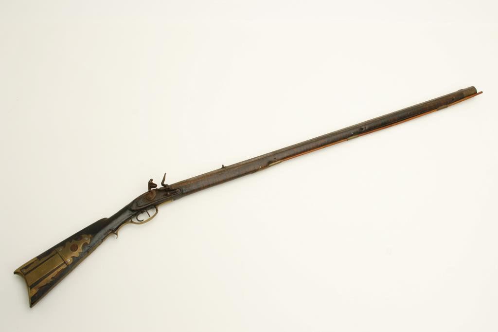 .41 caliber, 37” octagon barrel marked “No 36” on the top flat and with a brass inset marked “1843”, also on the top flat of the barrel; double set triggers, brass mounts including a brass patchbox on both sides of the butt stock; action displaying scattered surface rust and is not functioning; wood stock shows dark patina and several old repairs and a couple of age cracks. (Antique). Est.: $400-$800.
