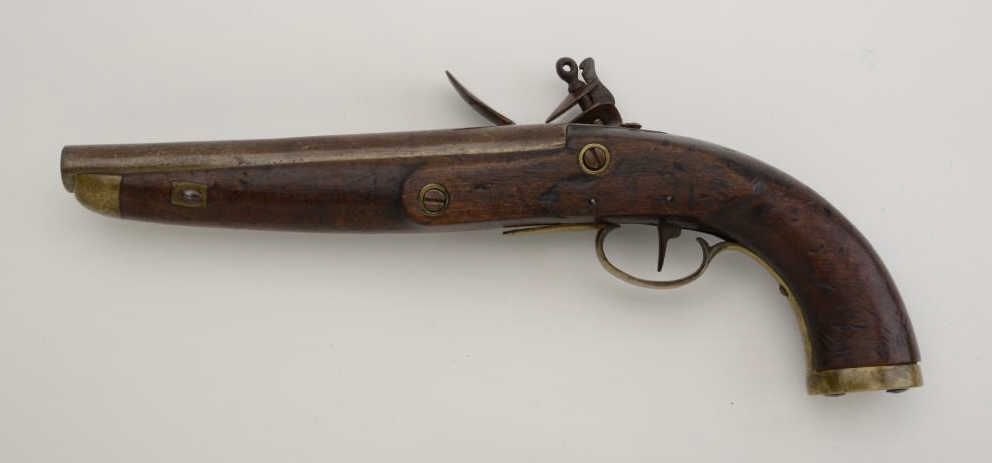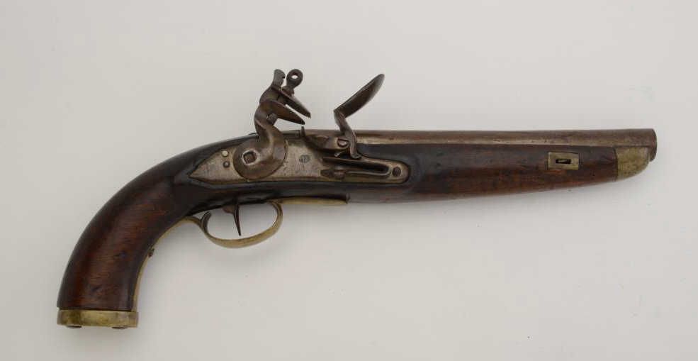 Flintlock pistol, .70 cal., 9” barrel, wood stock, brass mounts, in overall fair to good condition with grey patina, action not staying on full cock, good stock with scattered old mars and scratches from carryand storage; lots of character. Est.: $300-$600.