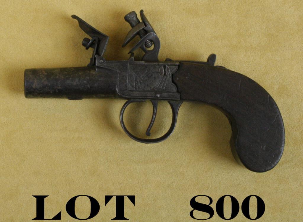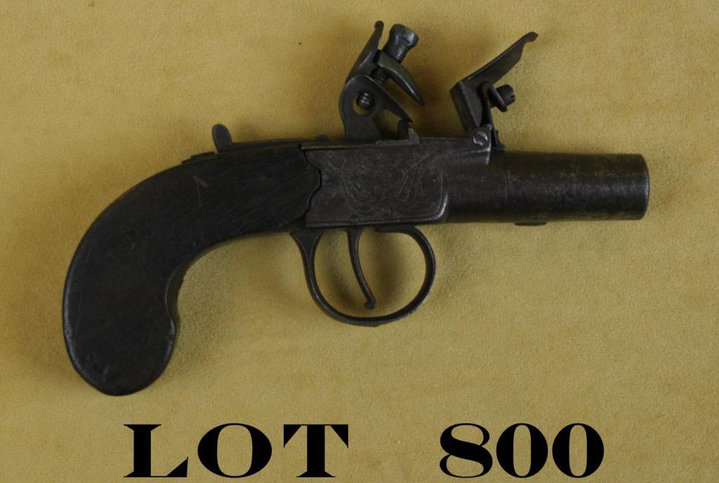 Flintlock single shot derringer marked “J. Hall, London”, .45 cal., 1-1/2” barrel, British proofed, wood grips. This gun is in overall good untouched condition showing a heavy brown patina on metal surfaces withscattered areas of erosion and some pitting, good action, dark bore, overall fair to good wood grips with some scattered mars and a small loss to the bottom front of the left side of the grip. Est.: $200-$400.