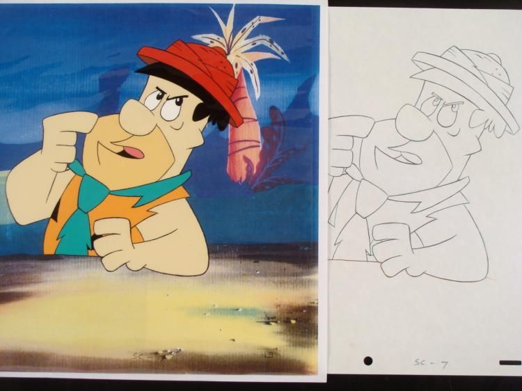 Hmmmm, now what did I do with my tool box again?? The cel comes with a matching drawing overlay. * * Original Production Art Cel, Drawing, and Reproduction Background Original "rough" animation drawing, with notations in black and non-photo blue. Fred has been outlined in black and non-photo blue * Overall Size of the Cel: 10 1/2" x 12 1/2" Overall Size of Reproduction Background: 11" x 13 1/4" * Excellent condition This is an original hand-painted cel set-up used in the production of an episode of "The Flintsones." Each one-of-a-kind set-up represents a slight change in position of the characters. When individually photographed and projected in rapid succession, the images appear to move. * To create production cels, the original animator's drawing is transferred onto an acetate cel (by hand-inking and/or photo copying). The cel is then hand-painted on the reverse side. The background accompanying this set-up is a reproduction background. * * The cel, drawing, and background are ready to be matted and framed. The animator's notations are shown at the bottom of the cel and drawing. *
