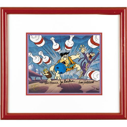 <B>The Flintstones "Kingpin" Limited Edition Hand Painted Cel #28/400 Original Art (Hanna-Barbera, undated).</B></I> Fred "Twinkletoes" Flintstone shows off his bowling skills in this hand painted cel. The work is matted and framed, with an image area of 12" x 9.5". In Excellent condition. Signed by creators Bill Hanna and Joe Barbera, and Iwao Takamoto. Does not include a certificate of authenticity.<BR><BR><b>Shipping:</b> Framed (<a target="_blank" href="http://www.heritageauctions.com/common/shipping.php">view shipping information</a>)