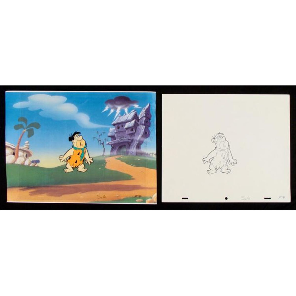 Wow, check that out... The cel comes with a matching drawing overlay. * * Original Production Art Cel, Drawing, and Reproduction Background Original "rough" animation drawing, with notations in black and non-photo blue. Fred has been outlined in black and non-photo blue. * Overall Size of the Cel: 10 1/2" x 12 1/2" Overall Size of Reproduction Background: 11" x 13 1/4" * Very Good condition This is an original hand-painted cel set-up used in the production of an episode of "The Flintstones." Each one-of-a-kind set-up represents a slight change in position of the characters. When individually photographed and projected in rapid succession, the images appear to move. * To create production cels, the original animator's drawing is transferred onto an acetate cel (by hand-inking and/or photo copying). The cel is then hand-painted on the reverse side. The background accompanying this set-up is a reproduction background. * * The cel, drawing, and background are ready to be matted and framed. The animator's notations are shown at the bottom of the cel and drawing. There is some minor creasing to the right corner of the background. *