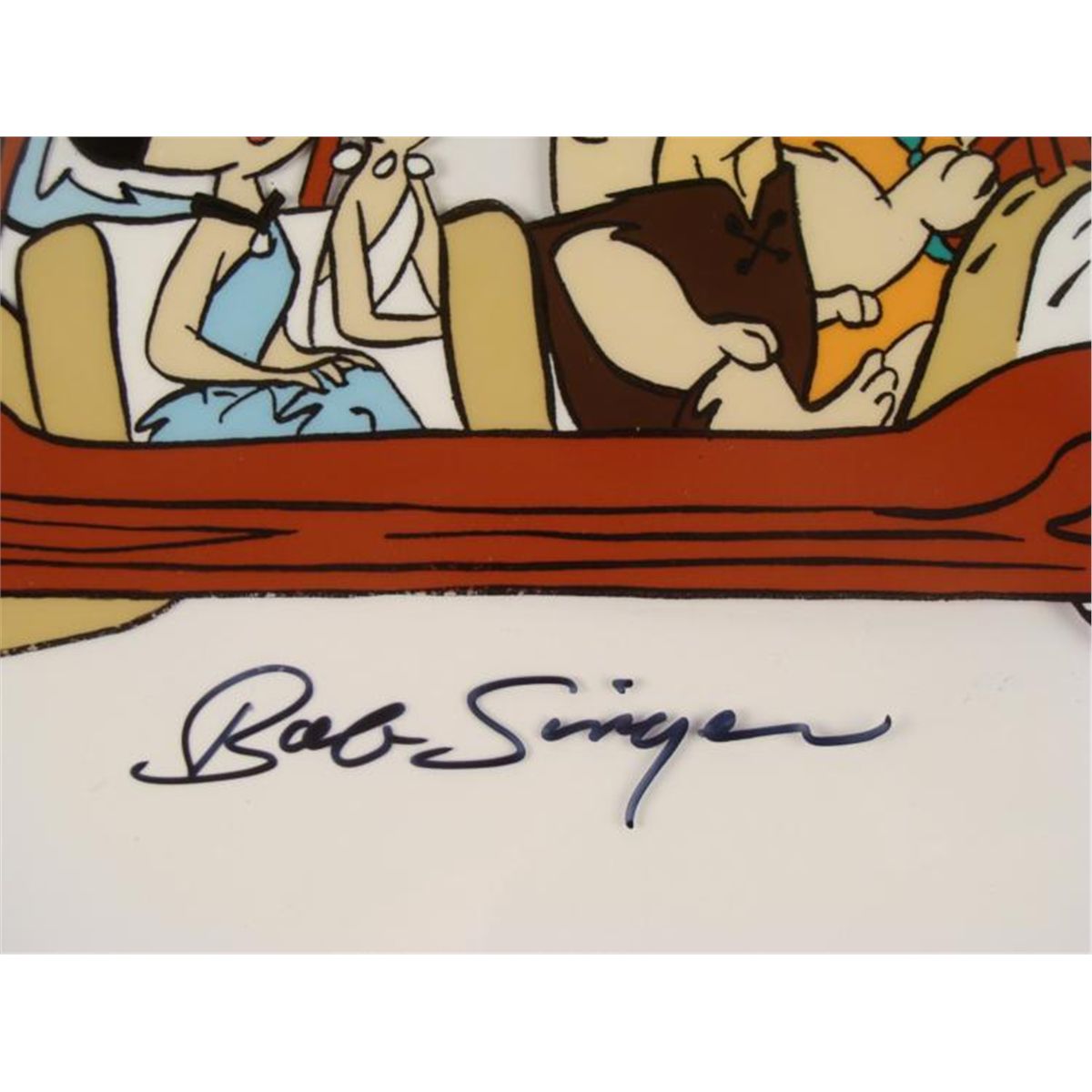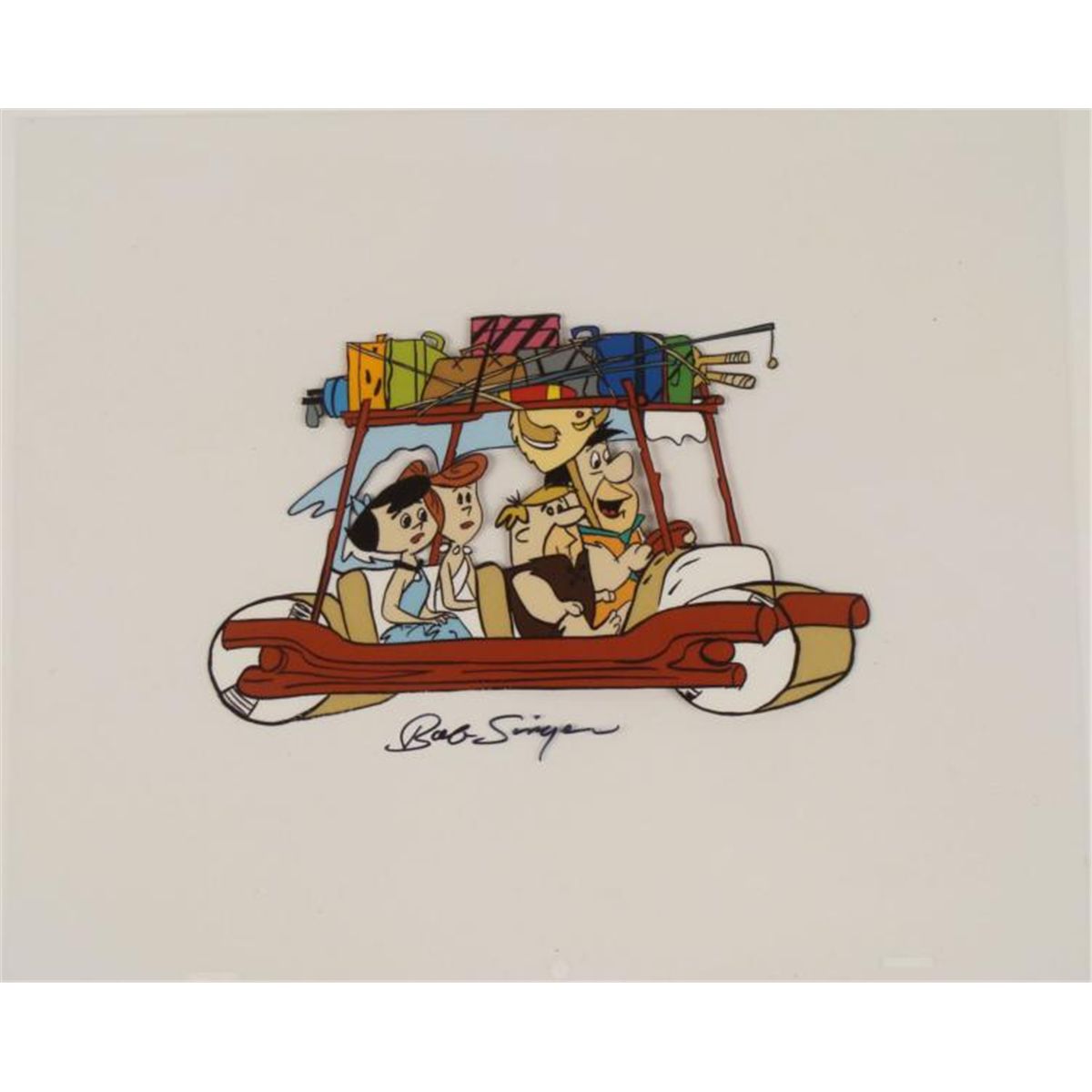 This is an original animation production model cel from "The Flintstones" show. * This cel shows Fred and Wilma along with the Barney and and Betty Rubble, all packed for a holiday getaway in their car. * Bob Singer's signature appears in black Sharpie at the bottom of the cel. * Bob Singer is an American animation artist, character designer, layout and background artist and storyboard director of animated television programs, most memorably of several Hanna Barbara productions such as The Flintstones, Jonny Quest, Scooby-Doo, Yogi Bear, Droopy, Tom and Jerry, The Jetsons, The Smurfs, Superfriends, and the Harlem Globe Trotters cartoons. * The Flintstones were the modern stone-age family, and are still as popular as ever. This is a classic original cel from one of the America's favorite cartoon families. * * * * Original Animated Cel, hand-painted, with peg holes along the bottom edge Overall Size of the Cel: 10 1/2" x 12 1/2" Excellent Condition -ready to be matted and framedThis is an original cel used in production. Each one-of-a-kind set-up represents a slight change in position of the characters. When individually photographed and projected in rapid succession, the images appear to move. * To create production cels, the original animator's drawing is transferred onto an acetate cel (by hand-inking and/or photo copying). The cel is then hand-painted on the reverse side. * * *