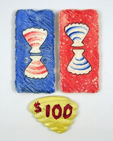 Flintstones Viva Rock Vegas Money & Playing Cards Props - The Steven Spielberg executive produced live action "The Flintstones" (taking the credit of Steven Spielrock!) was such a success that a prequel was made a few years later, "The Flintstones in Viva Rock Vegas" (2000), with the original cast and some amazing guest stars. These are a set of screen used Rock Vegas props, including a literal $100 "Clam", and two playing stone cards. (Cards are approx 7'x3.5", Clam is 4"x3").