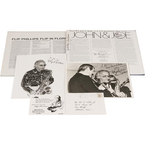 <B>Flip Phillips Signed Record and Photo Group.</B></I> Tenor saxophone titan Flip Phillips takes the spotlight in this offering. Included are: "Flip Phillips - Flip in Florida" (Onyx Records ORI 214) with its cover signed by Flip Phillips (and a signed photo of Phillips as well as a signed letter); and "John and Joe- Kenny Daven and Flip Phillips" (Chiaroscuro CR199) with its cover signed by Phillips, Kenny Davern, George Duvivier, Dave McKenna, and Bobby Rosengarden (and a signed photo of Phillips and Davern). <I>From the Al White Jazz autograph archive.</B></I><BR><BR><b>Shipping:</b> Recordings (<a target="_blank" href="http://www.heritageauctions.com/common/shipping.php">view shipping information</a>)