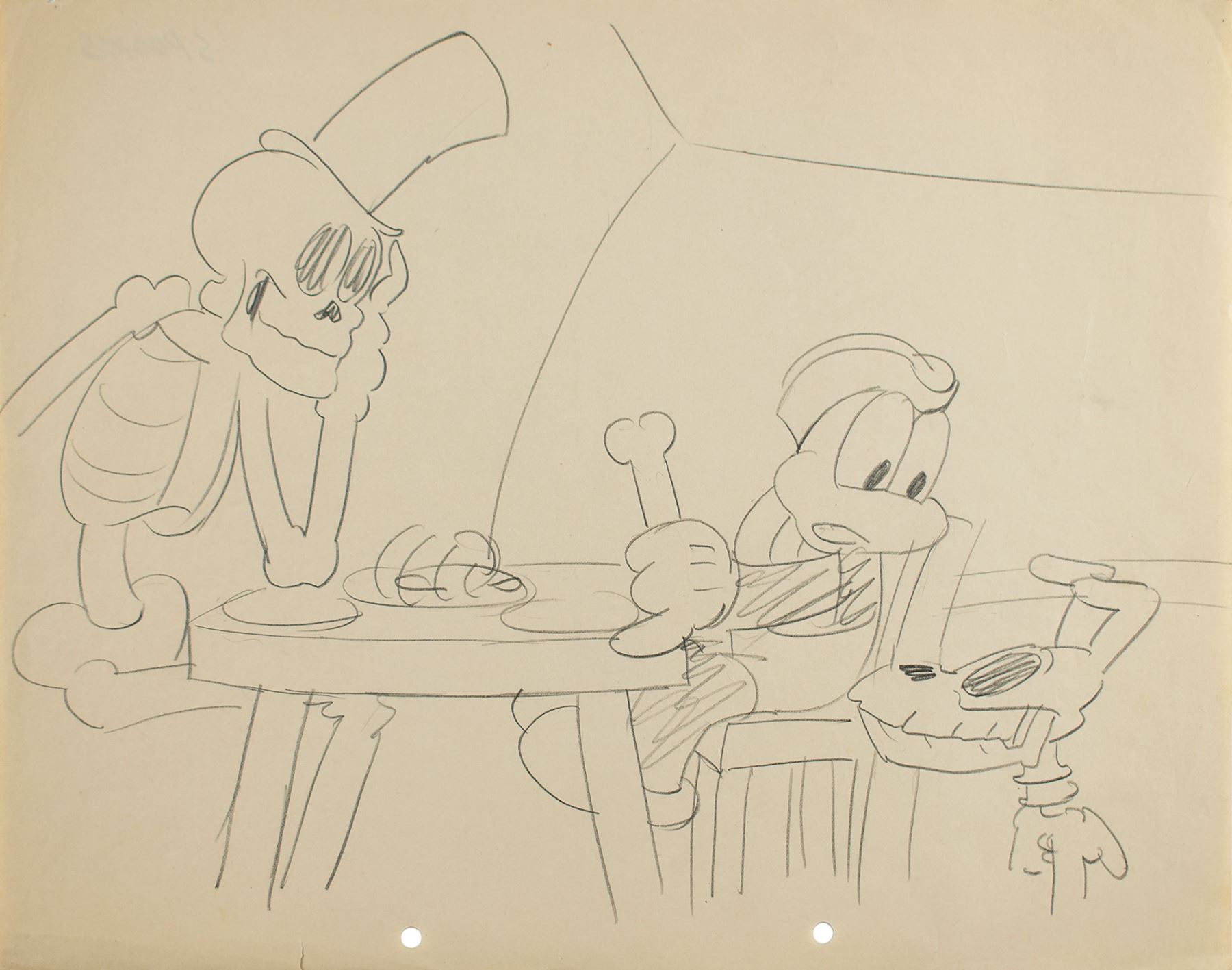 (Ub Iwerks Studio, 1932) Original layout drawing by Ub Iwerks featuring Flip the Frog from Spooks, showing the frog seated at a table with a human skeleton and looking down at the skeleton of a dog. Accomplished in graphite on untrimmed 12 x 9.5 animation paper. Total image measures 12 x 9, filling almost the entire page. In fine condition. Iwerks was a pioneering animator and early partner of Walt Disney, with whom he co-created Oswald the Lucky Rabbit and Mickey Mouse.