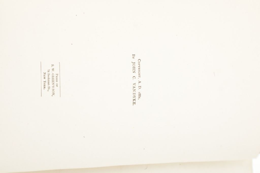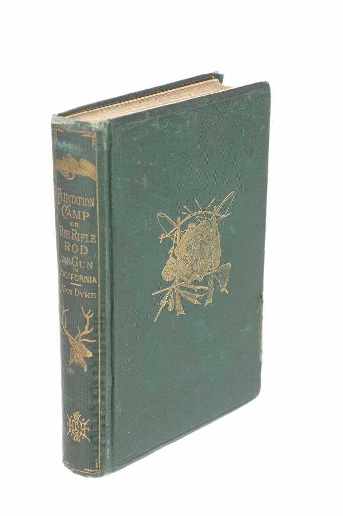 Offered in this lot is an 1881 first edition of "Flirtation Camp or The Rifle Rod and Gun in California" by Theodore S. Van Dyke (1842-1923). This is a sporting romance novel. The book is bound in green linen with gold gilt on the spine and a gold gilt picture of a dog and hunting/fishing equipment on the cover. This book is in fair condition, with wear on the corners of the cover and foxing on the paper. The book measures 5" x 7.5".
