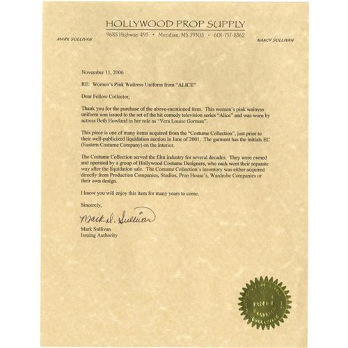 <B>Flo and Vera Costume Waitress Uniforms from "Alice."</B></I> A nice pair of pink waitress costumes worn by Polly Holliday and Beth Howland in their roles as "Flo" and "Vera" on the hit sitcom. In Excellent condition with the actresses' first names written on the collars in black ink.<I>Accompanied by LOA from Hollywood Prop Supply.</B></I><BR><BR><b>Shipping:</b> Clothing, Costumes & Jerseys (<a target="_blank" href="http://www.heritageauctions.com/common/shipping.php">view shipping information</a>)