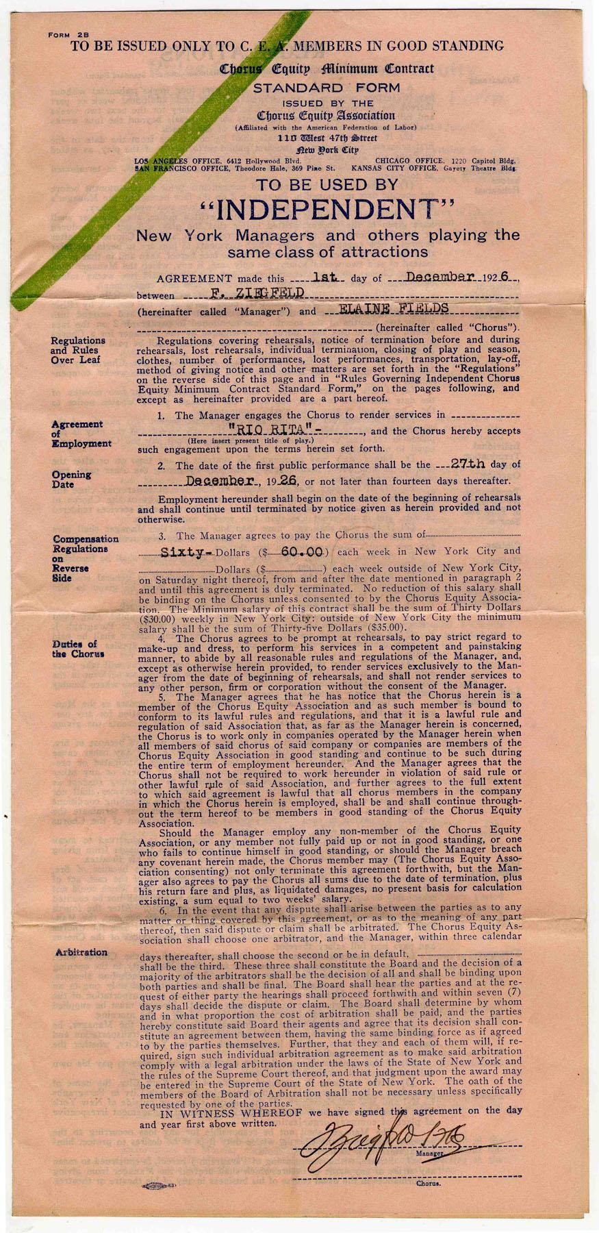 Broadway visionary Flo Ziegfeld 6.5'' x 14'' contract signed, dated 1 December 1926 for the opening musical ''Rio Rita'' at his famed Ziegfeld Theater in New York City. Contract negotiates salary for actress Elaine Fields. Lot also includes two candid photos of Fields, a notice to actors about being late to rehearsals and a 8.5'' x 7.25'' typed letter signed by producer Sam Harris. Near fine condition.