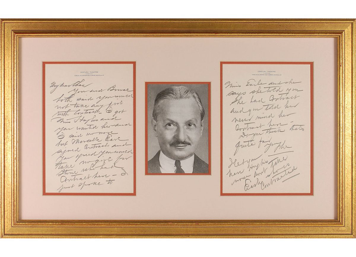 ALS in pencil, signed “Flo,” two pages, 7 x 10, Century Theatre letterhead, no date but circa 1916. Letter to his partner Charles Dillingham, scolding him for attempting to steal a chorus girl who was under contract to the Follies. In full: “You and Bruce both said you would not take any girl with contract. I got Miss Hughes and you wanted her and I said no more but take Marcella Earle signed contract and you said you would take no girl for Stone who had contract here. I just spoke to Miss Earle and she says she told you she had contract and you told her never mind her contract here. Do you think that’s quite fair. I let you have Hughes, now don’t take Earle who is contracted.” Double-matted and framed with a portrait of the impresario to an overall size of 27.75 x 17. In fine condition. Oversized.