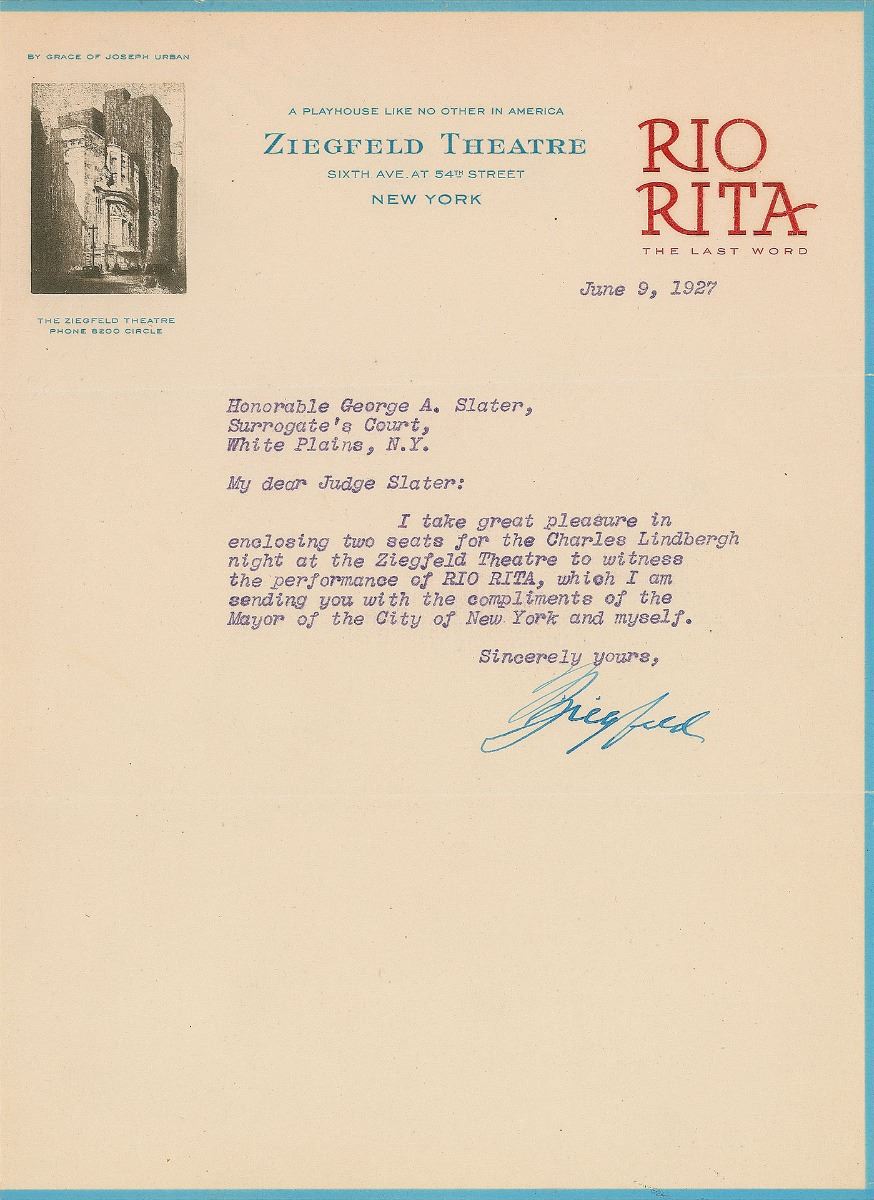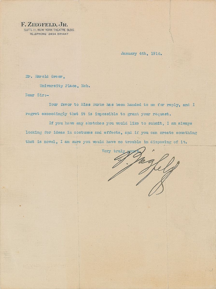 Two TLSs signed “F. Ziegfeld, Jr.,” and “F. Ziegfeld,” both one page, 7.75 x 10.5, personal and Ziegfeld Theatre letterhead. The first, dated January 4, 1916, a letter to Harold Greer, in part: “You favor to Miss Burke has been handed to me for reply, and I regret exceedingly that it is impossible to grant your request.” The second, dated June 9, 1927, a letter to Judge Slater, in full: “I take great pleasure in enclosing two seats for the Charles Lindbergh night at the Ziegfeld Theatre to witness the performance of RIO RITA, which I am sending you with the compliments of the Mayor of the City of New York and myself.” In overall very good to fine condition. Accompanied by a third letter bearing a secretarial signature, dated August 18, 1921, in part: “As soon as Miss Burke receives the script of the play she will decide upon, I will be pleased to let you know if there is anything in it that would interest you.”