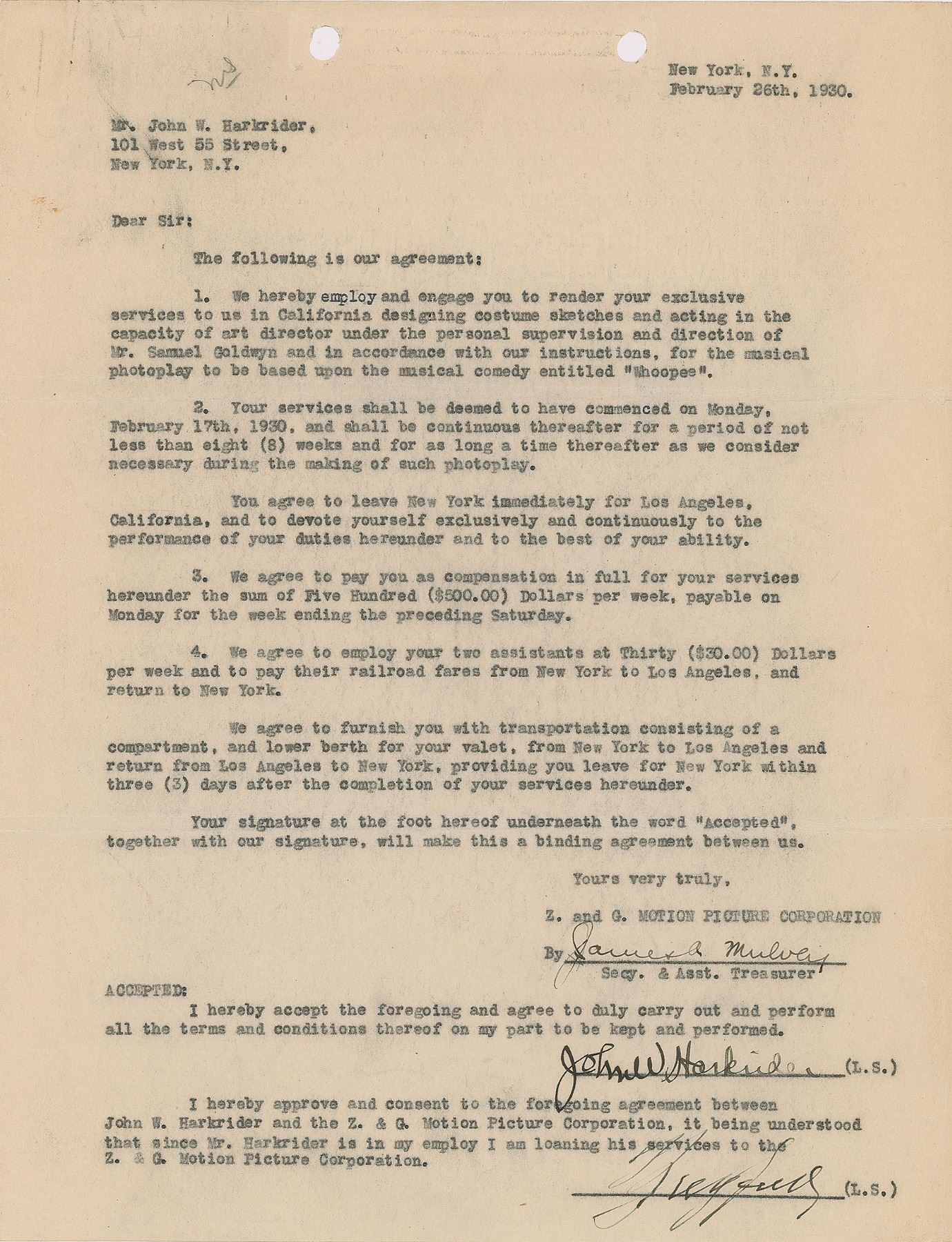 DS, signed “F. Ziegfeld,” one page, 8.5 x 11, February 26, 1930. Contract between John W. Harkrider and the G. Motion Picture Corporation, with the former agreeing to render his exclusive services "designing costume sketches and acting in the capacity of art director under the personal supervision and direction of Mr. Samuel Goldwyn…for the musical photoplay to be based upon the musical comedy entitled 'Whoopee.'" Signed at the conclusion in fountain pen by Ziegfeld, who gives his approval of the contract. In fine condition.