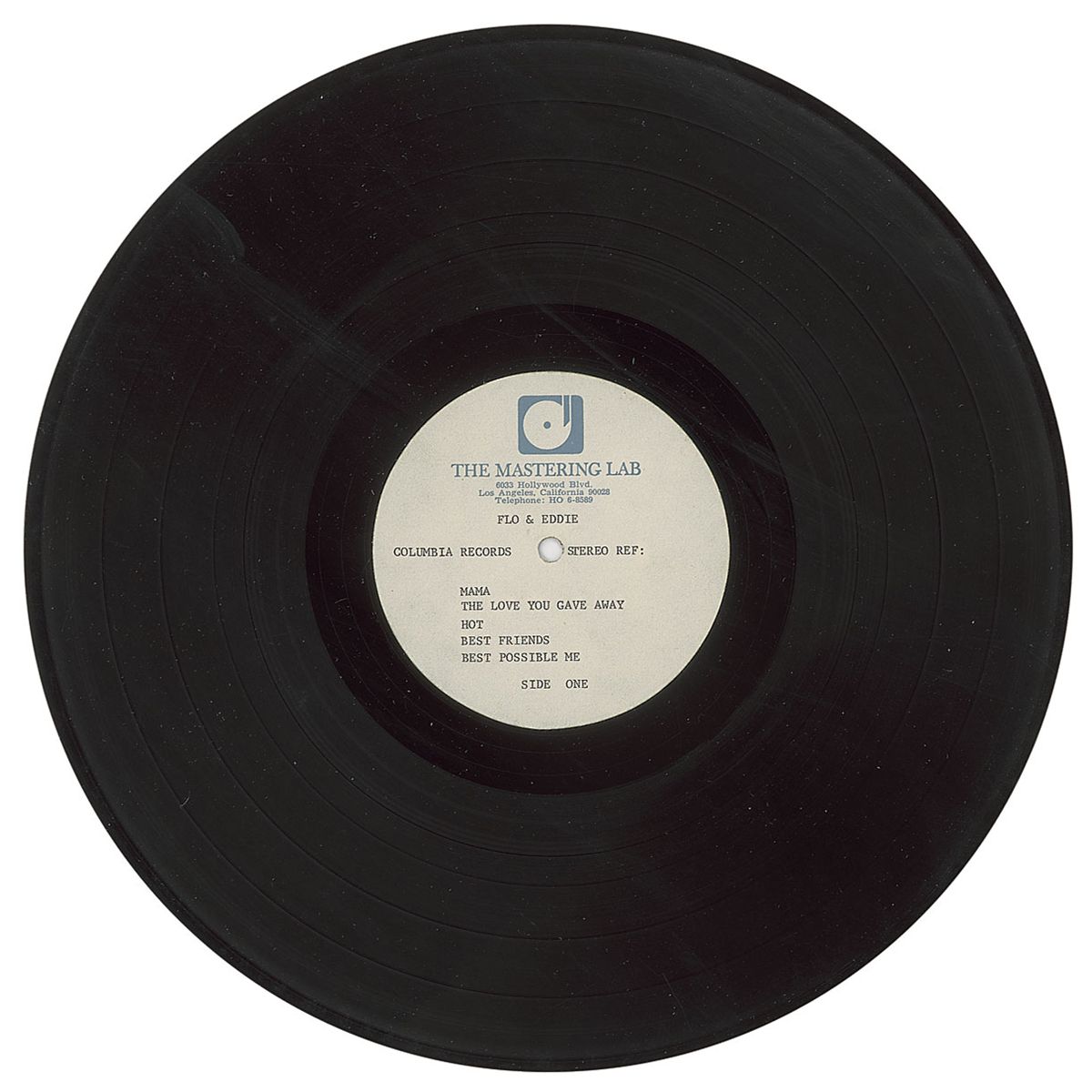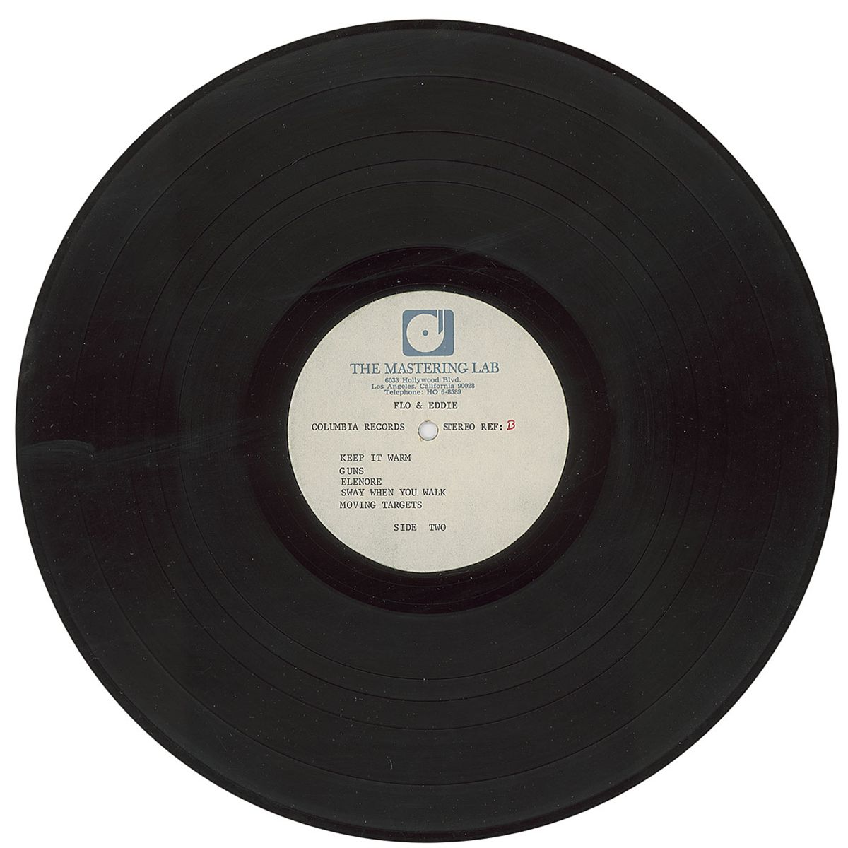 Columbia Records double-sided 12? acetate of Flo and Eddie’s 1976 album Moving Targets, each side featuring songs that correspond with those appearing on the final record. Identified in type on The Mastering Lab labels with relevant track listings and artist info. In very fine condition. Accompanied by the original sleeve from The Mastering Lab.