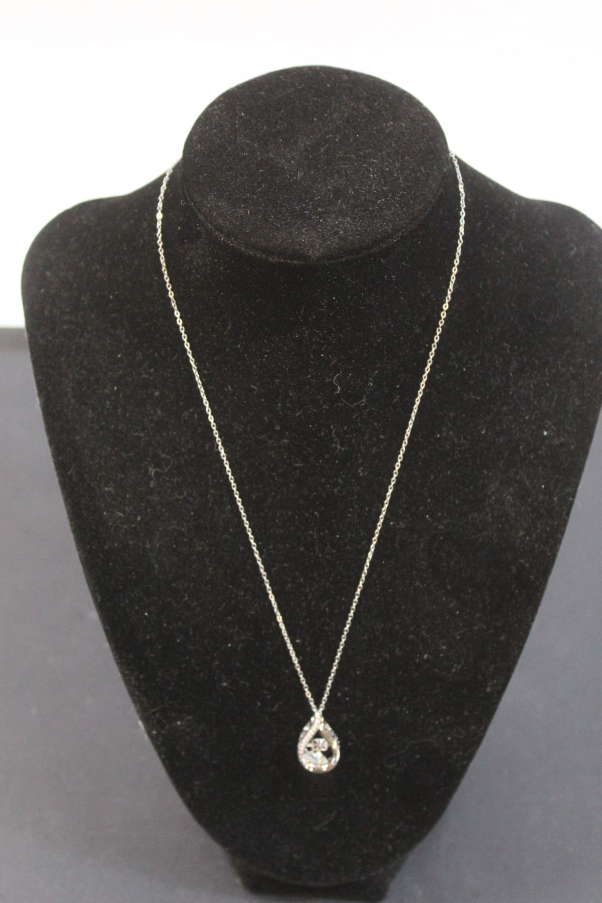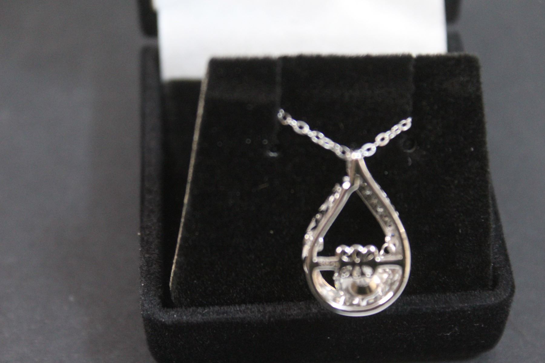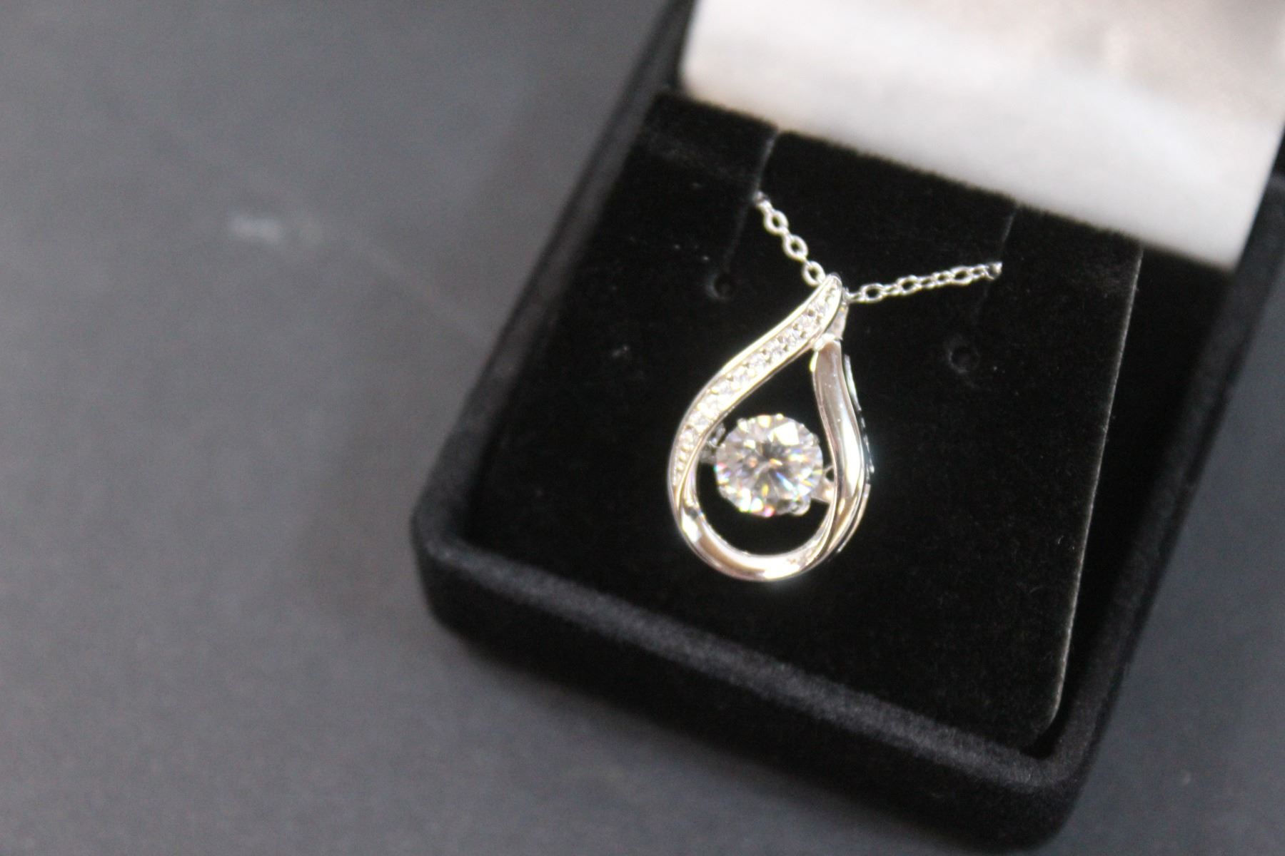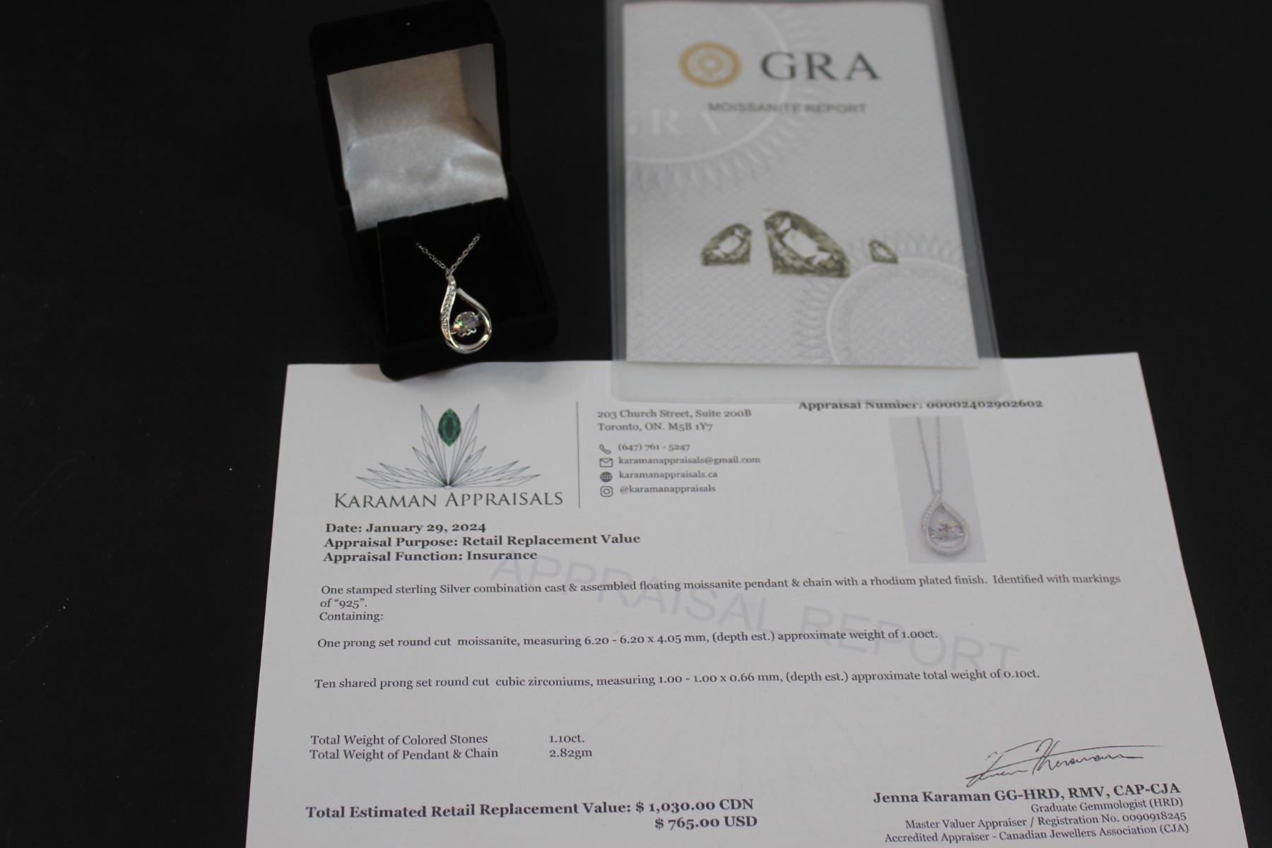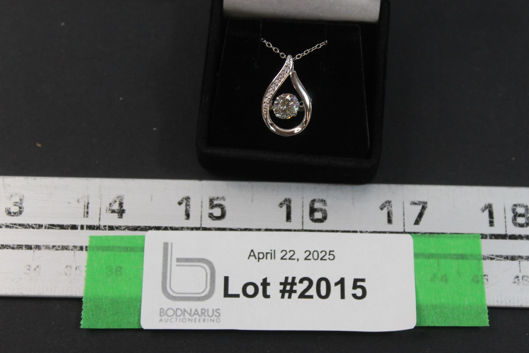 ^ Floating 1 ct. Round Brilliant Cut Moissanite Stone VVS D Color w/(10) round Brilliant Cut Cubic Zirconia Set on One Side of Tear Drop Shaped Pendant Set in Sterling Silver Pendant