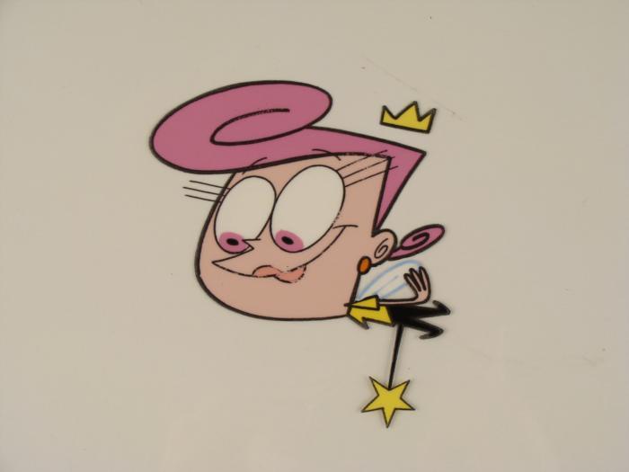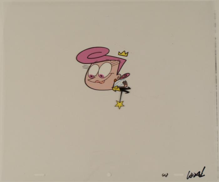 This original animation cel is from the Nickelodeon TV show Fairly Odd Parents. Timmy Turner is a short, buck-toothed 10-year-old boy with a pink cap who lives in Dimmsdale, a small suburban town with his dim-witted parents. His life is constantly miserable, due to the fact that his parents are rarely home and he is babysat by an incredibly evil teenager, Vicky, and that, generally, no one understands him (as indicated by the show's theme song). But everything changes when he receives two fairy parents: Cosmo and his wife, Wanda and later, their son Poof. Timmy learns that his fairy godparents are capable of granting him any wish he wants within certain limits. However, Timmy's immature nature causes him to sometimes ask for wishes that unintentionally result in disaster, and he and his fairy parents and fairy brother must find a way to "unwish" the wish. Here, Wanda is just floating around. Original Production Animated Cel Overall Size of Cel: 10 1/2" x 12 1/2" Excellent ConditionThis is an original hand-painted cel set-up used in the production of an episode of "Fairly Odd Parents." Each one-of-a-kind set-up represents a slight change in position of the characters. When individually photographed and projected in rapid succession, the images appear to move.