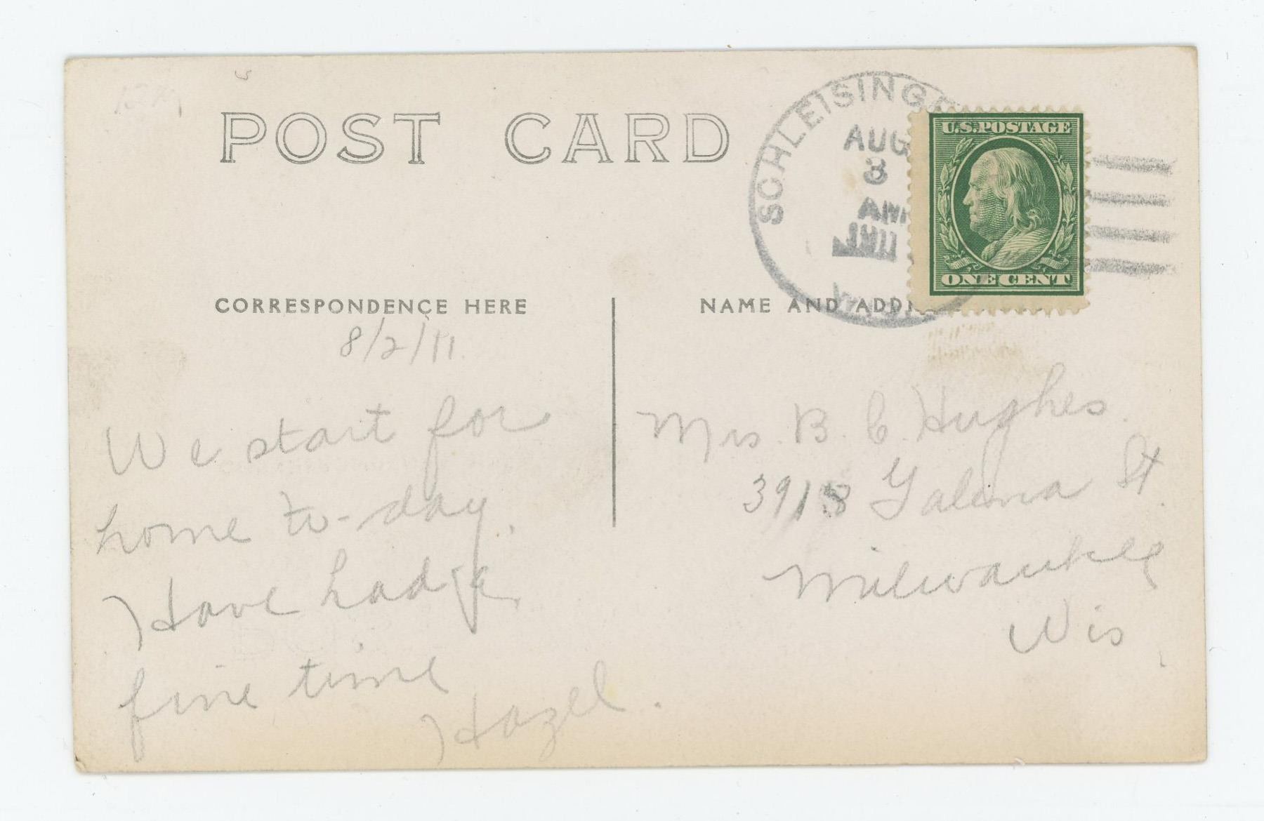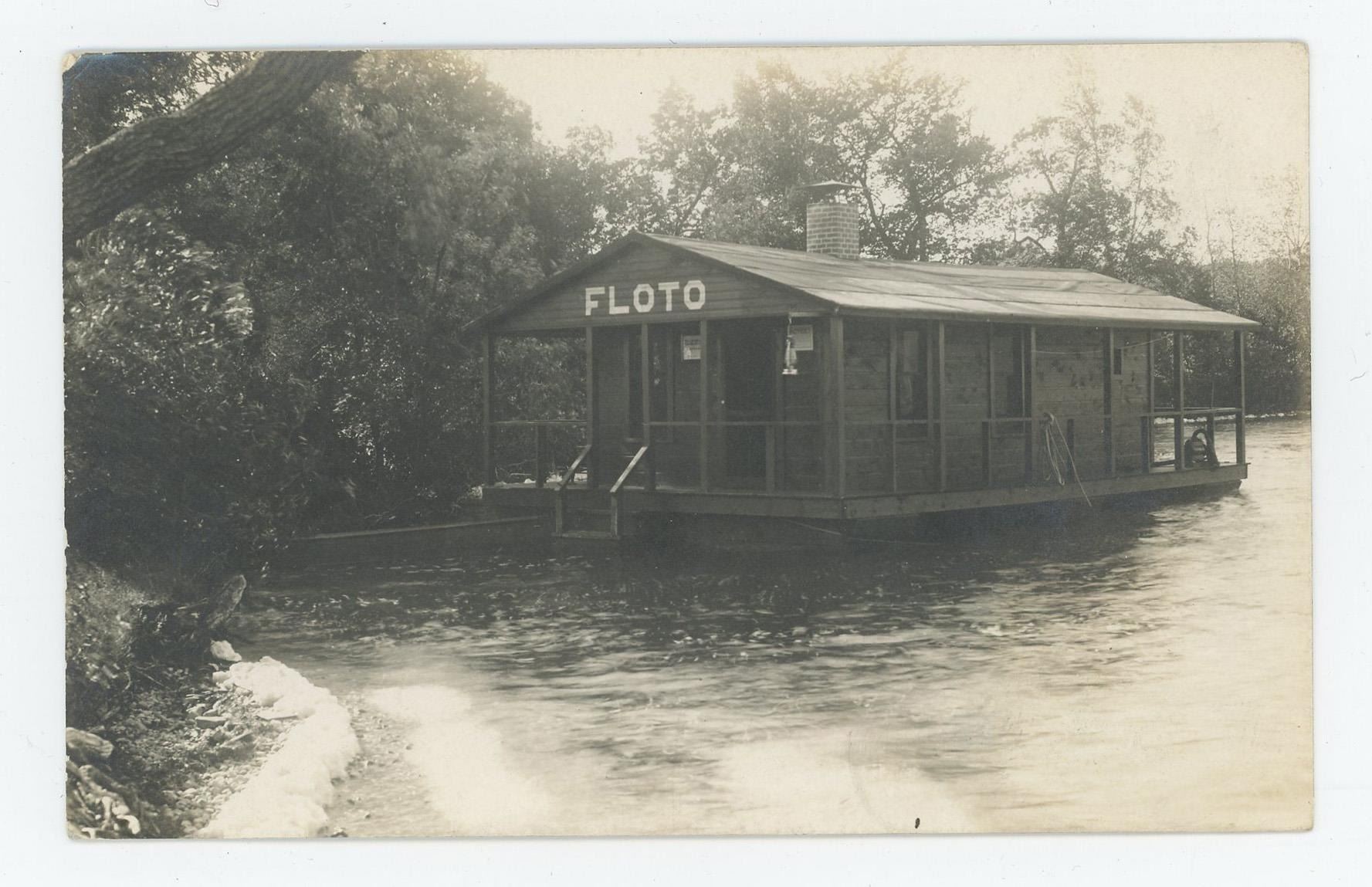 The stamp on the backside dates this post card to 1911. Skilled photographer Sam Levy and his nephews started "Floto," a floating photo studio in the early 20th century. Levy and his nephew would dock the large watercraft, similar to a houseboat, just north of Rosenheimer’s Resort on the south end of Big Cedar Lake in Wisconsin.