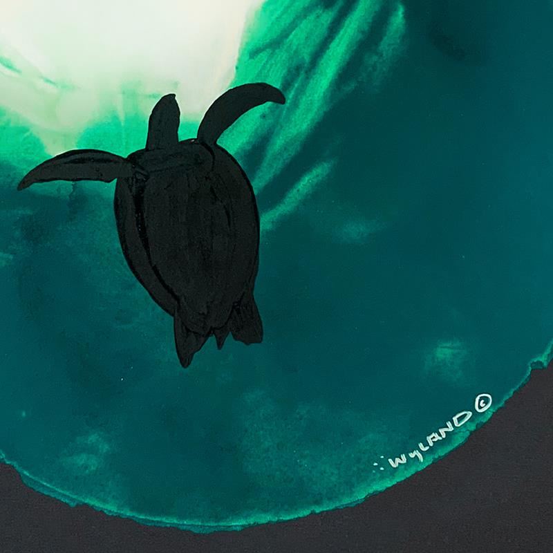 "Floating Sea Turtle" is an original painting, watercolor on deckle edge paper by Wyland. Hand signed by the artist, the piece comes custom framed and with a letter of authenticity. Measures approximately 30" x 30" (framed), 19.5" x 19.5" (image).