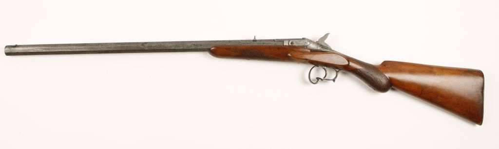 Unique breechloading single shot rifle. Wood is in overall good condition with the points of the checkering worn down. The metal finish is worn to a mottled grey with slight discoloration from surface rust . Octagonal untapered barrel is 24" long and the bore has good rifling with overall rough surfaces. Condition is Fair to Good as an antique. *Antique Firearm*