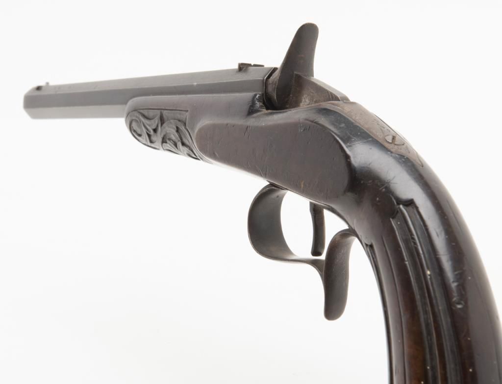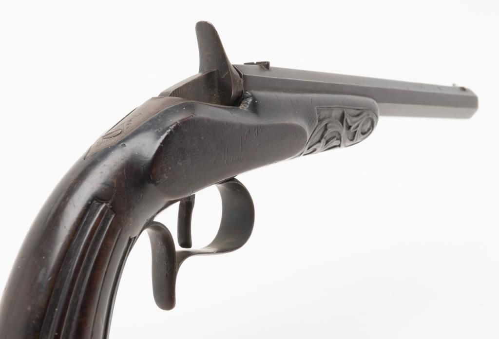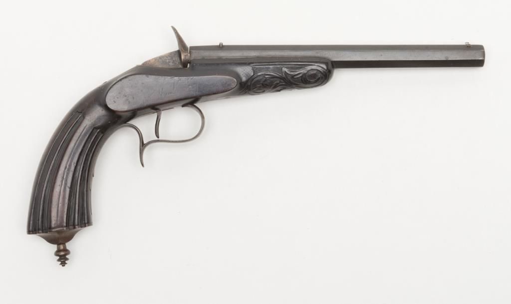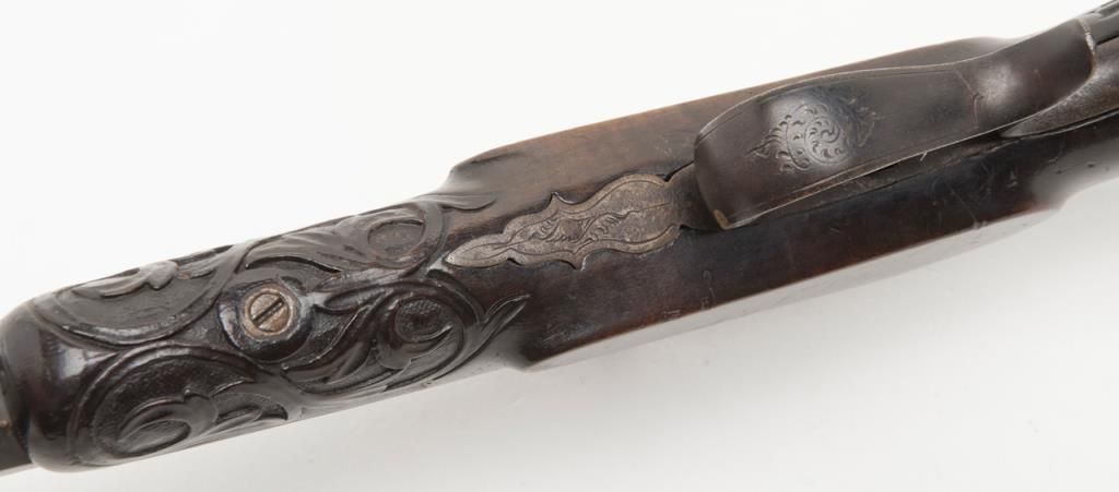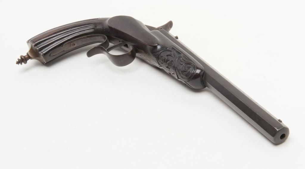 Flobert single shot pistol, .22 cal., 9” octagon barrel, blue finish, raised carved stock in overall good condition with a dark patina on metal surfaces, good action, dark bore, good wood. (Antique). Est.: $150-$250.