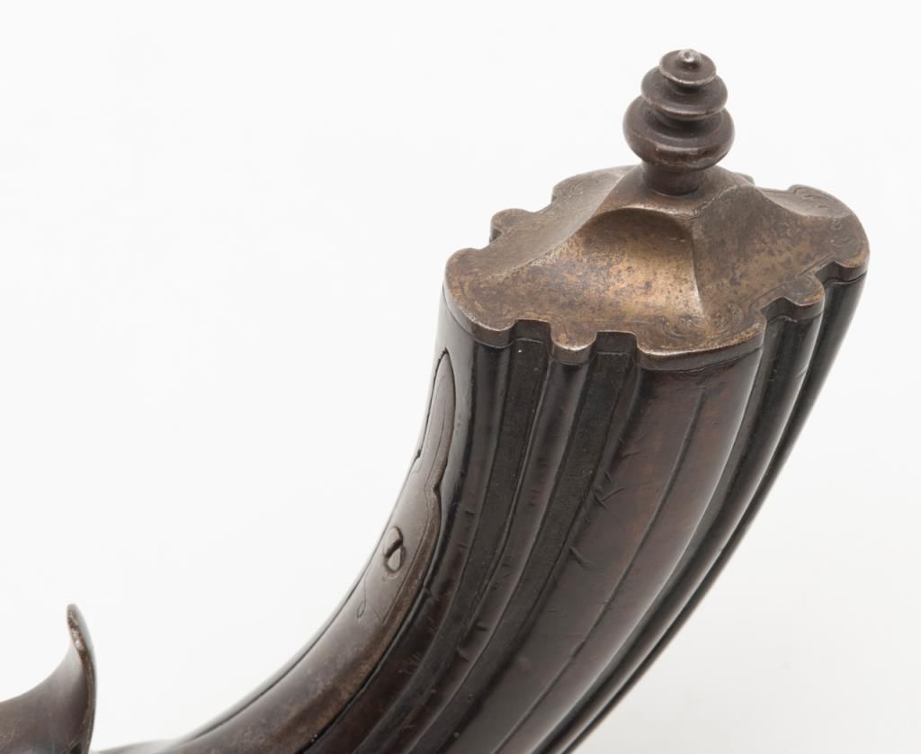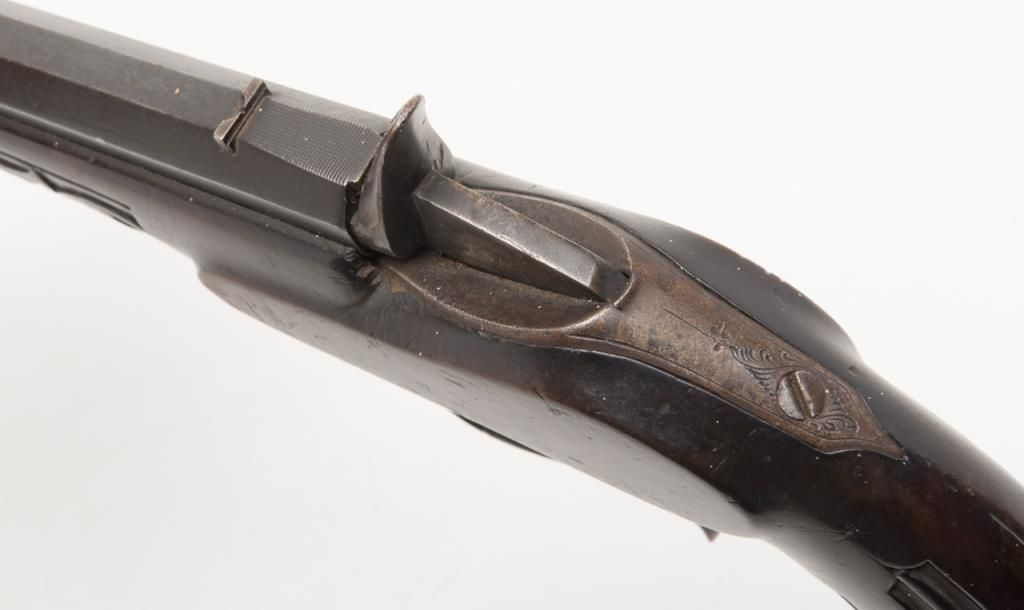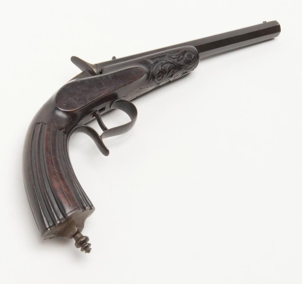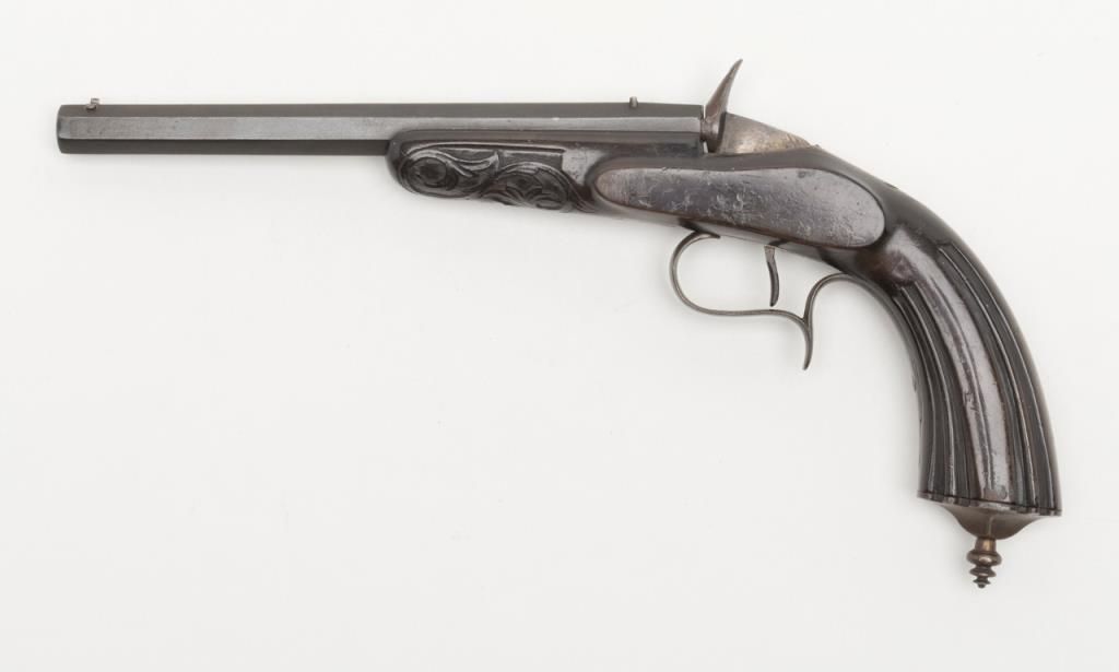 Flobert single shot pistol, .22 cal., 9” octagon barrel, blue finish, raised carved stock in overall good condition with a dark patina on metal surfaces, good action, dark bore, good wood. (Antique). Est.: $150-$250.