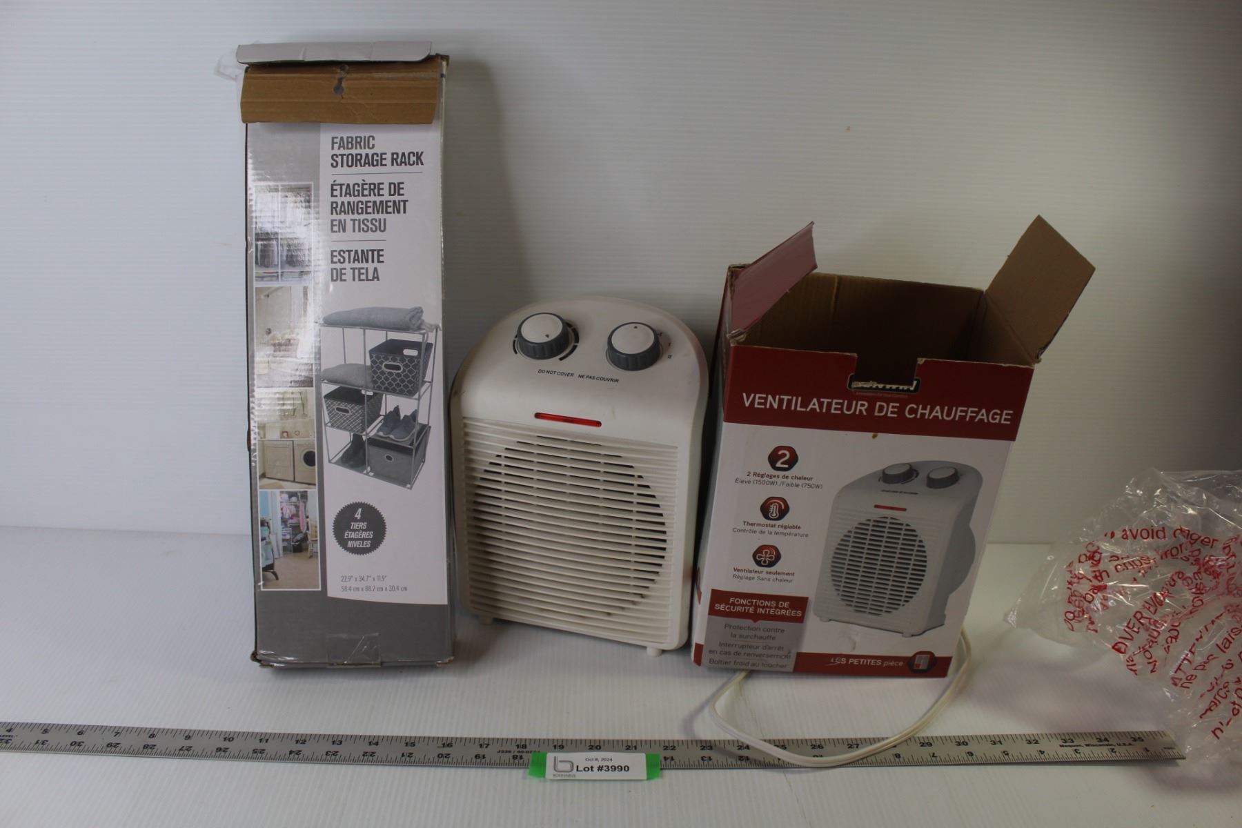 Floor Heater (powers on - as is) - Fabric Storage Rack in Box (unknow completion)