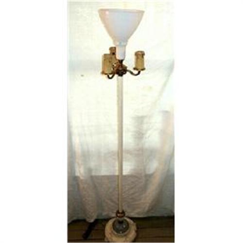 Floor Lamp, early 1900s, 5 lights in all: 1 3-way center; 3 arms and 1 base/nite light; rewired, shade included.</em></td>