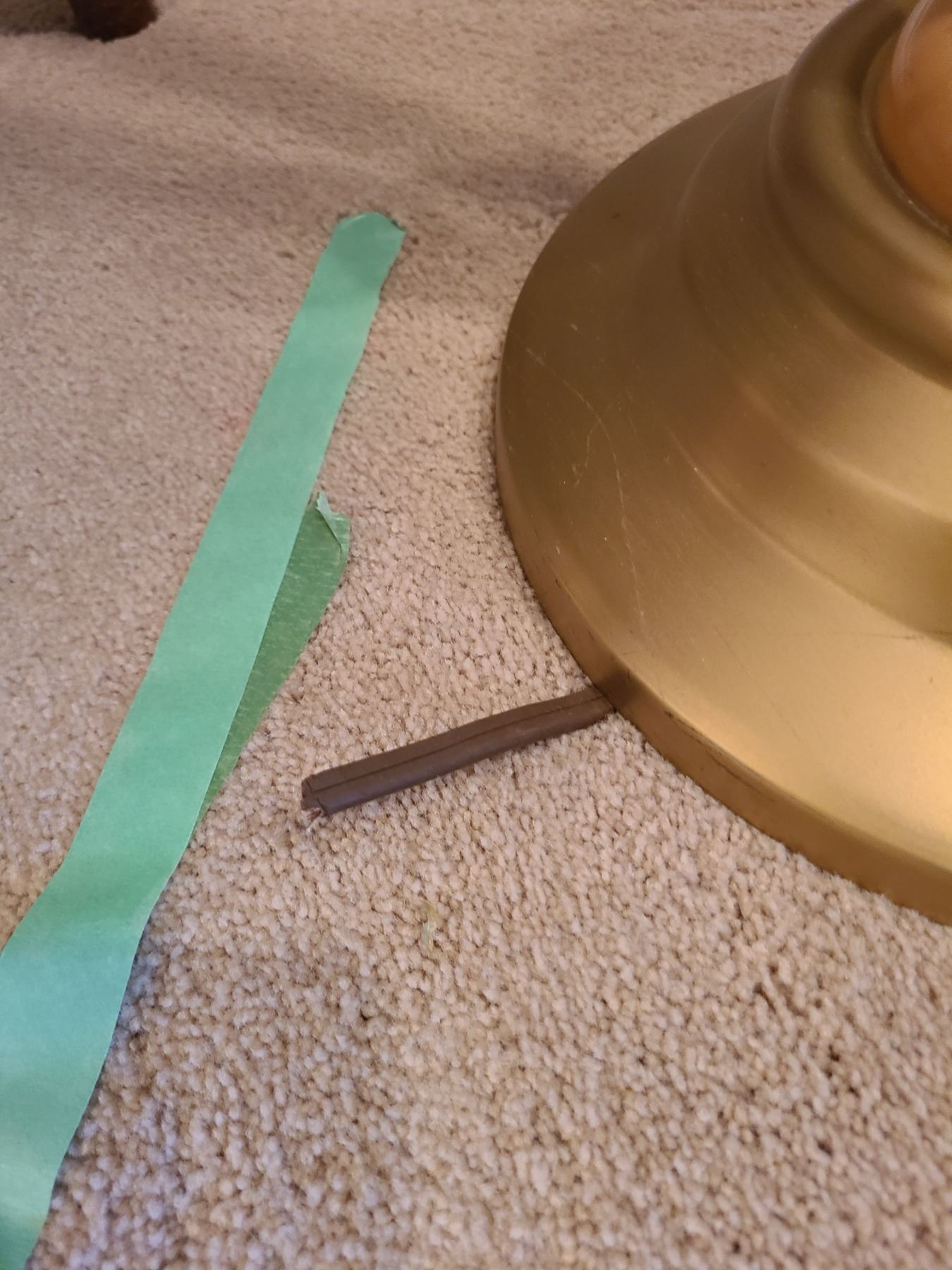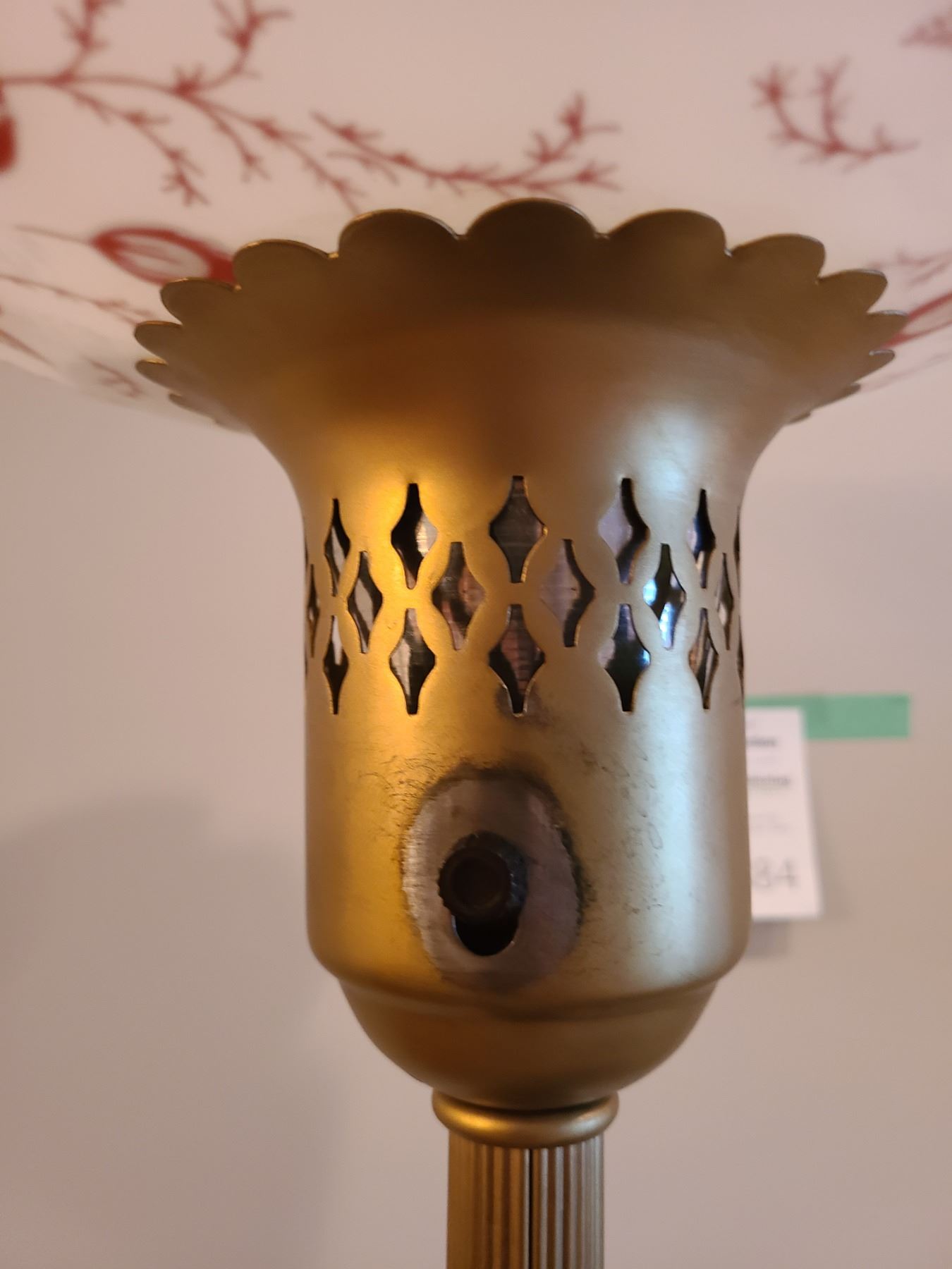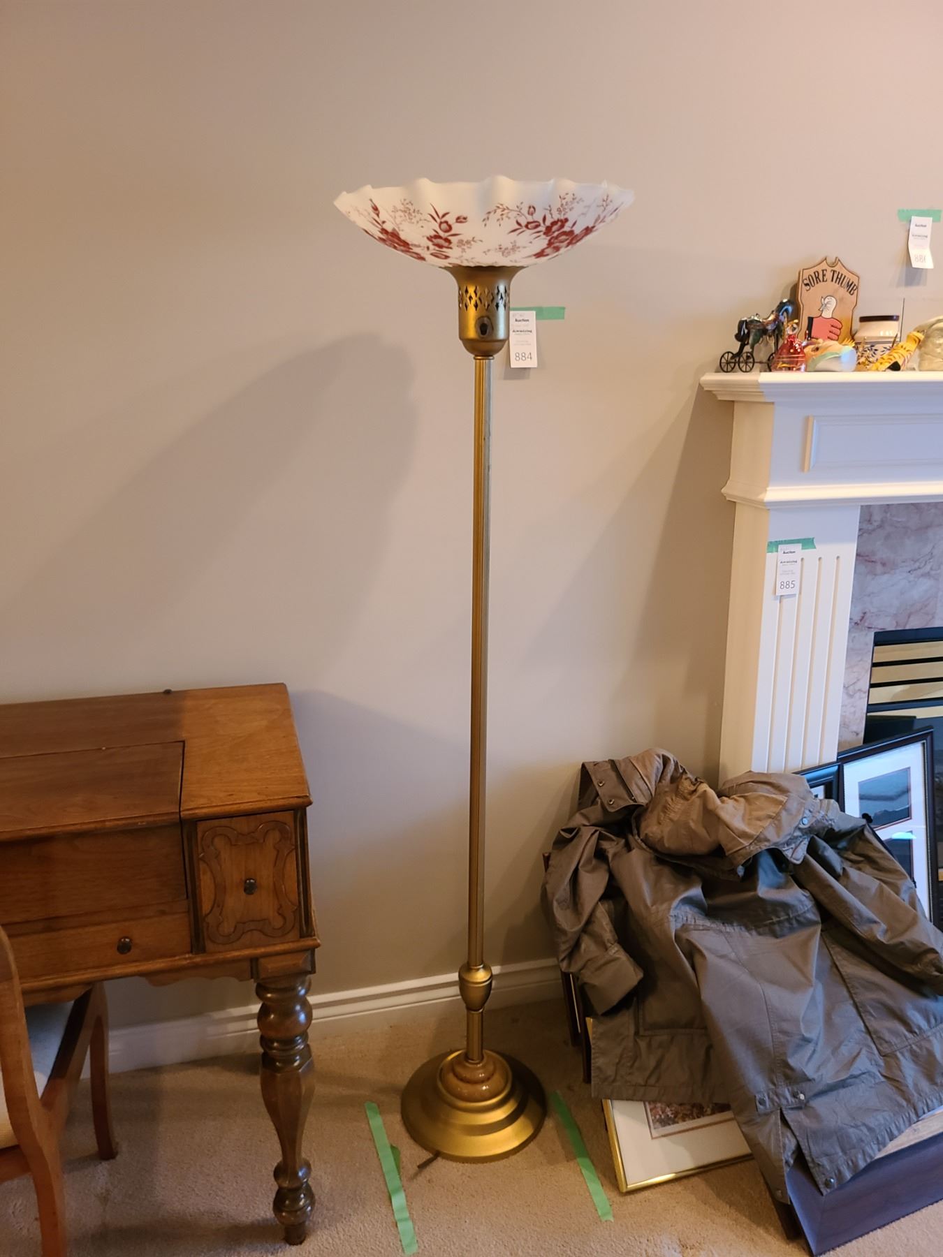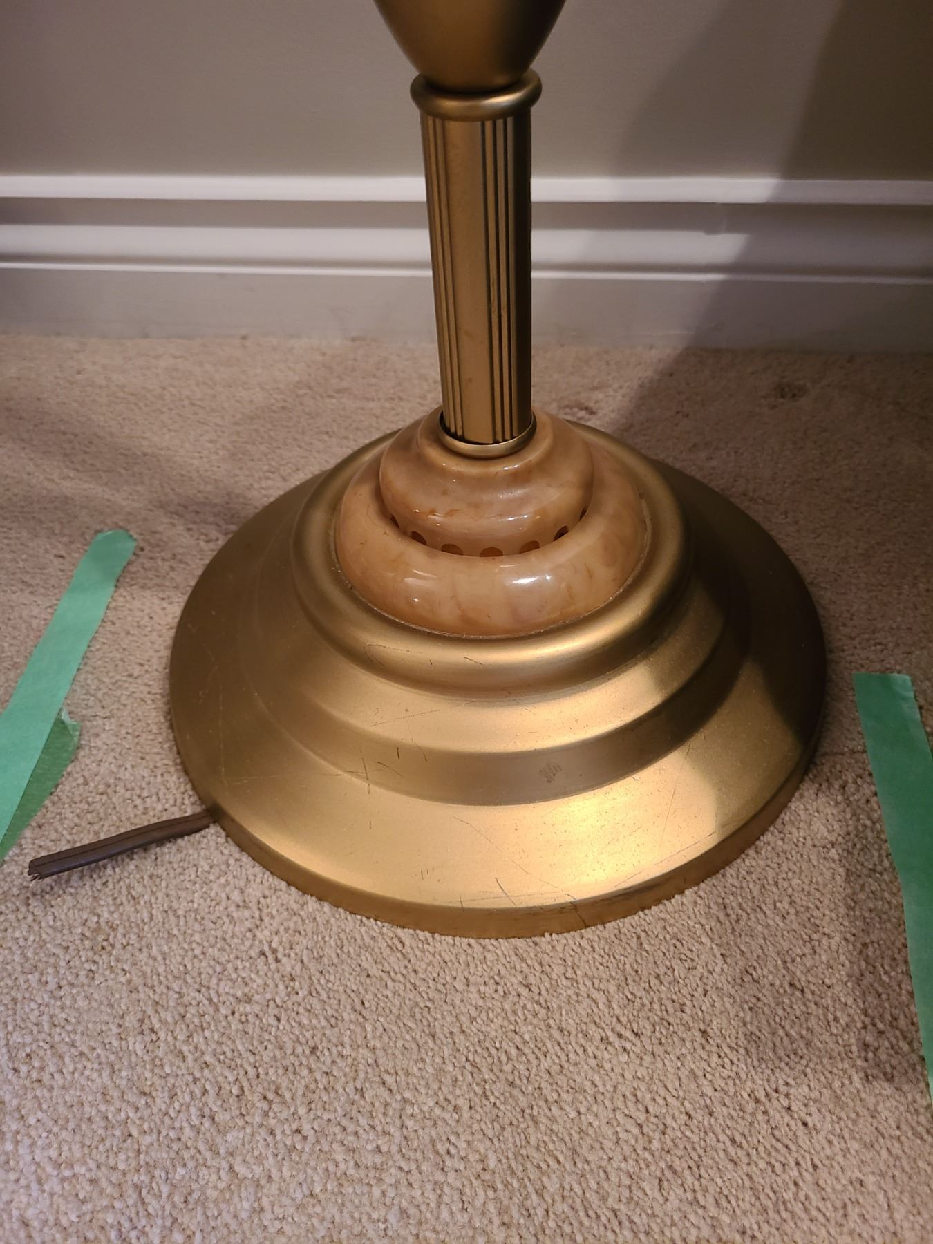 Brass floor lamp 65 in. tall with no power cord. Part of base is only pink plastic. Pickup 11 am.