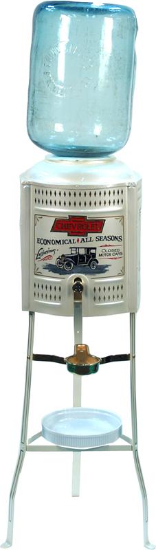Floor Model Liquid Dispenser w/ Spigot w/ Chevrolet advertisement, restored w/ embossed glass pitcher "Solus Springs Beacon Falls, CONN."