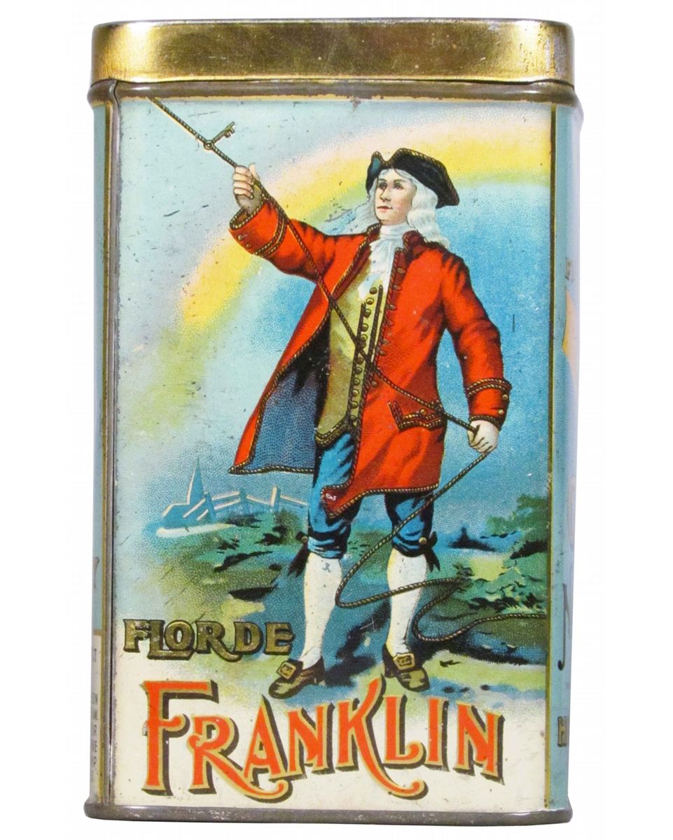 Flor De Franklin Cigar Tin for 25 Cigars. Some edge wear and light scratches otherwise excellent condition. 3 1/4 X 5 1/4 X 3 1/4 inches.