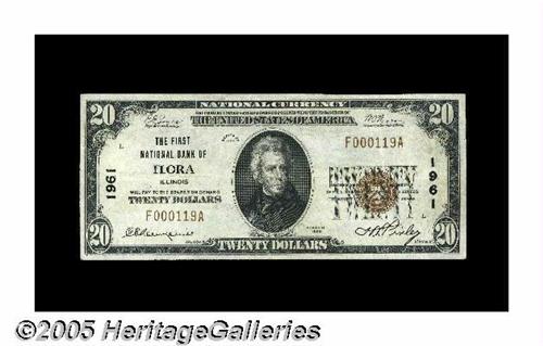 <B>Flora, IL</B></I> - $20 1929 Ty. 1 <B>The First NB</B></I> Ch. # 1961<BR>A <B>Very Fine</B></I> example from the somewhat more available of the two banks to issue from here, although notes from this institution can be frustratingly difficult to locate. A few scattered pinholes can be found in this still quite fresh piece. If your travels bring you here, be sure to check out the Little Toot railroad ride at Charlie Brown Park.
