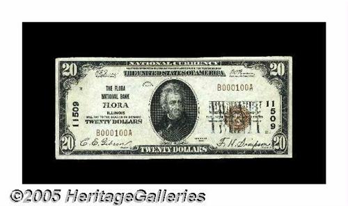<B>Flora, IL</B></I> - $20 1929 Ty. 1 <B>The Flora NB</B></I> Ch. # 11509<BR>We sold the Very Fine Serial #1 Type 1 Twenty from here at our 2004 Milwaukee Central States Signature Sale for $2,070. Tonight's #100 example is a nice <B>Extremely Fine</B></I> and will likely see strongly competitive bidding. While two banks issued from here, this is the scarcer one and printed only 182 sheets of this type and denomination. If you've ever used Minwax products to finish furniture or floors, you contributed to the local economy here.