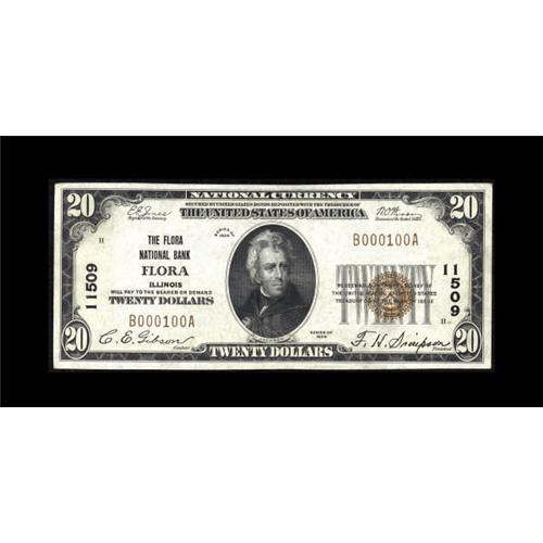 <B>Flora, IL</B></I> - $20 1929 Ty. 1 <B>The Flora NB</B></I> Ch. # 11509<BR> While two banks issued from here, this is the scarcer of the pair. Although seven examples of this type and denomination are documented in the census, this <B>Extremely Fine</B></I> note is the nicest by a considerable margin, with the balance of the population being in the Very Good to Fine range. <BR><BR><b>Shipping:</b> Coin/Currency (<a target="_blank" href="http://www.heritageauctions.com/common/shipping.php">view shipping information</a>)